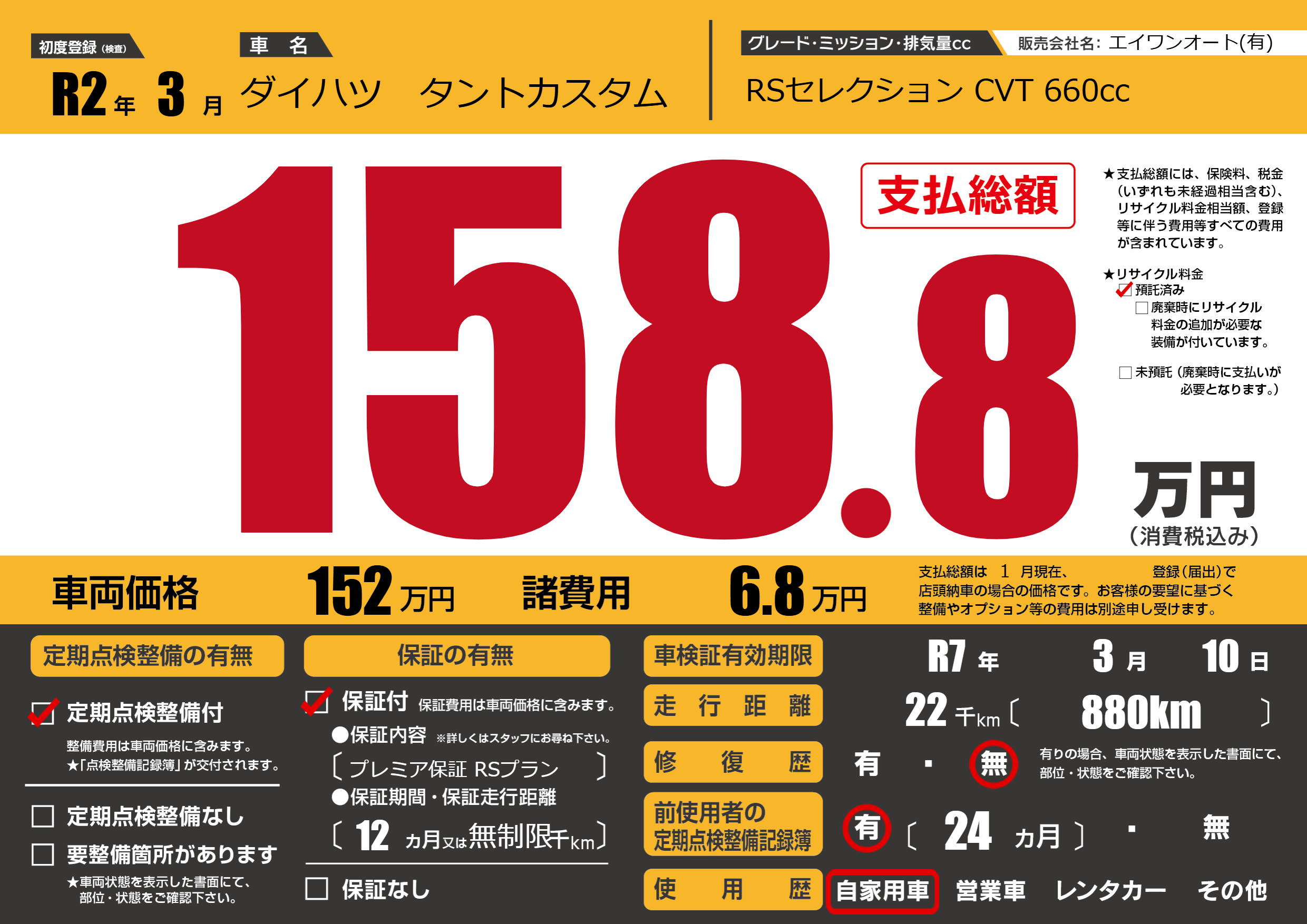 | 走行キロ | 2.2万km | 初年度登録 | R2年3月 |