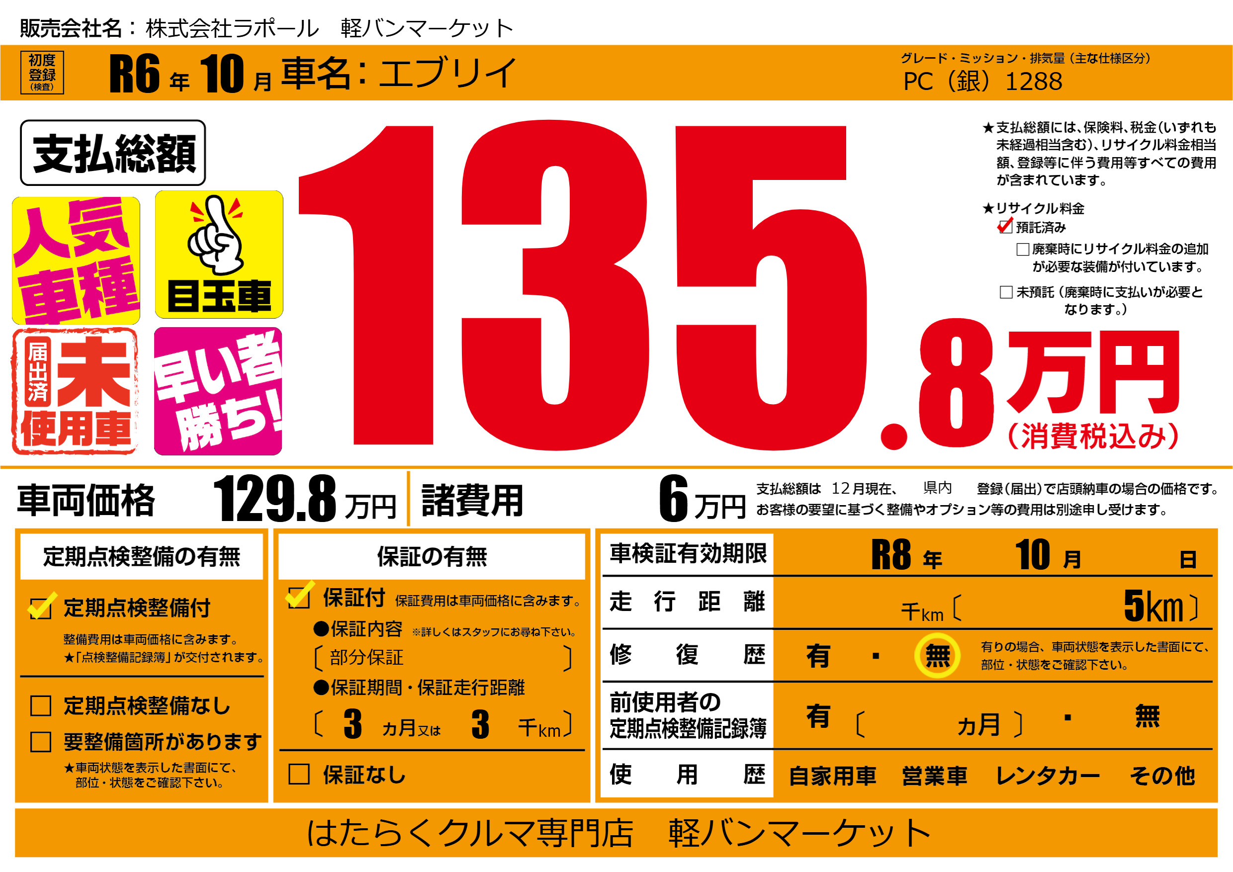 なし | 車検制限 | R8年10月---月 |