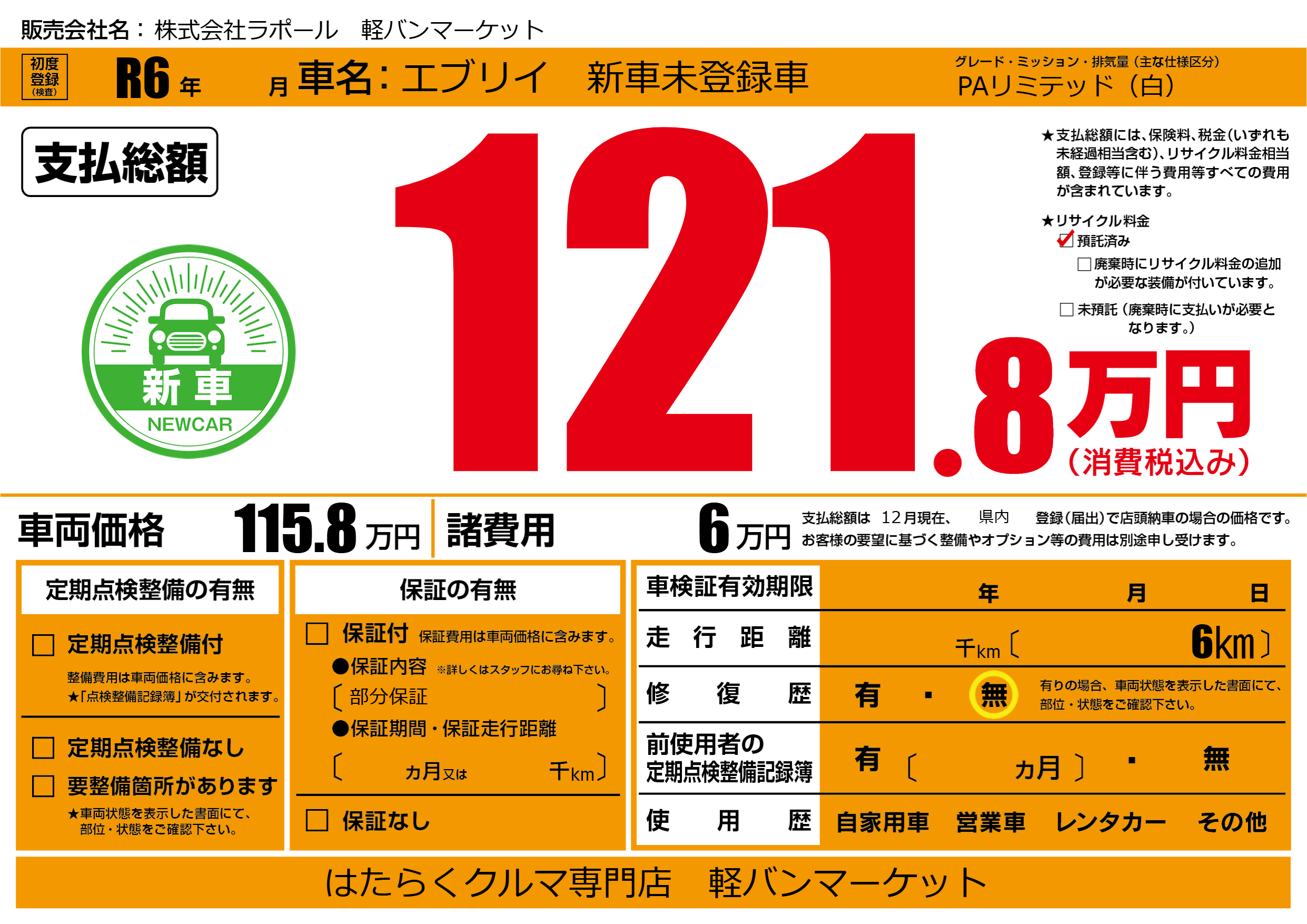 | 車名 | エブリイ 新車未登録車 | グレード ミッション 排気量 |