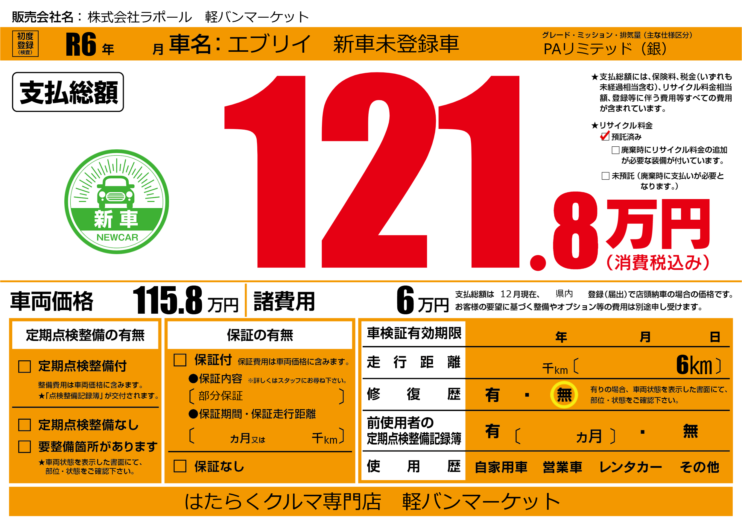 | 車名 | エブリイ 新車未登録車 | グレード ミッション 排気量 |