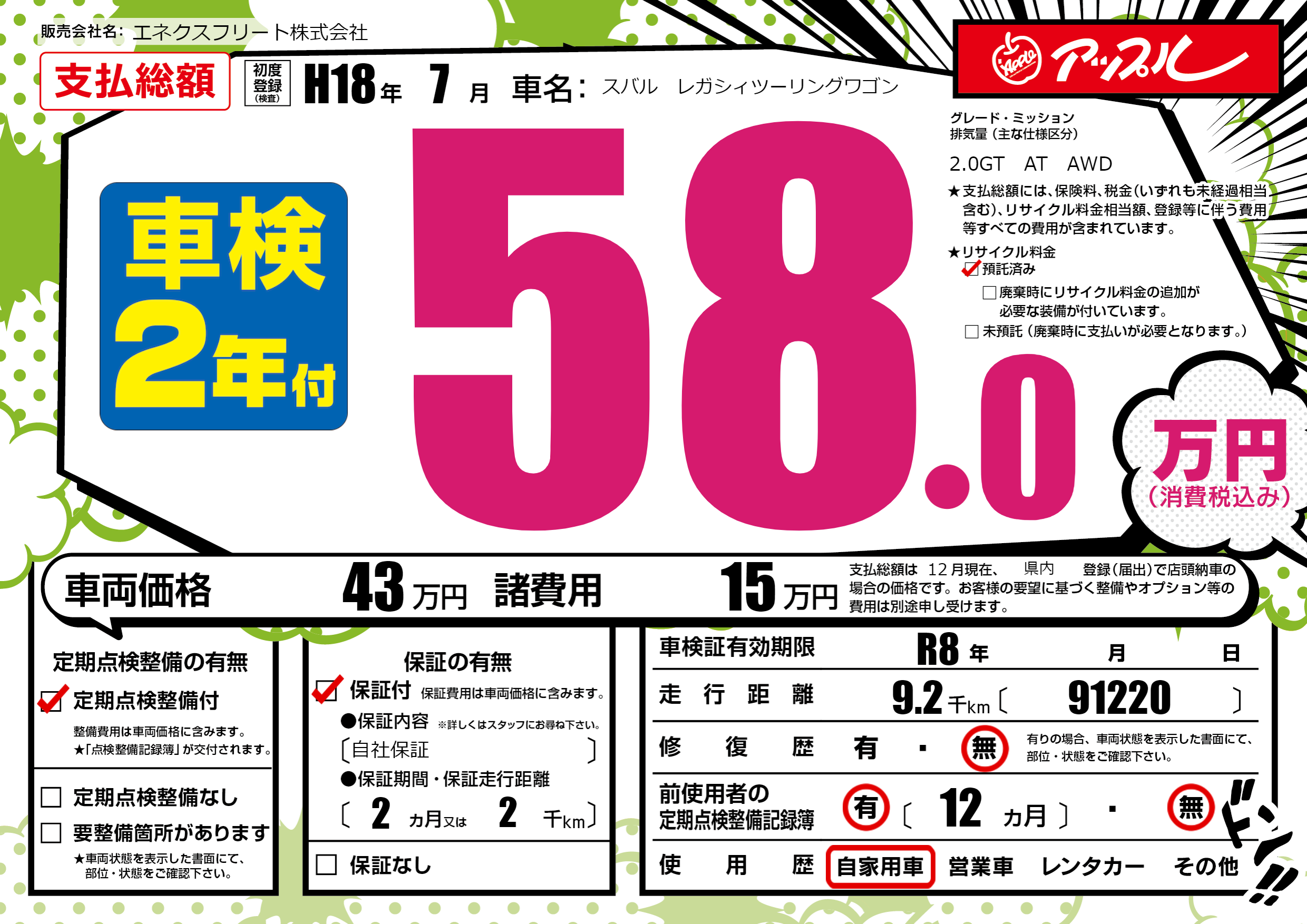 保証付き 保証内容(自社保証) 2ヶ月または(2)千kmまで |
