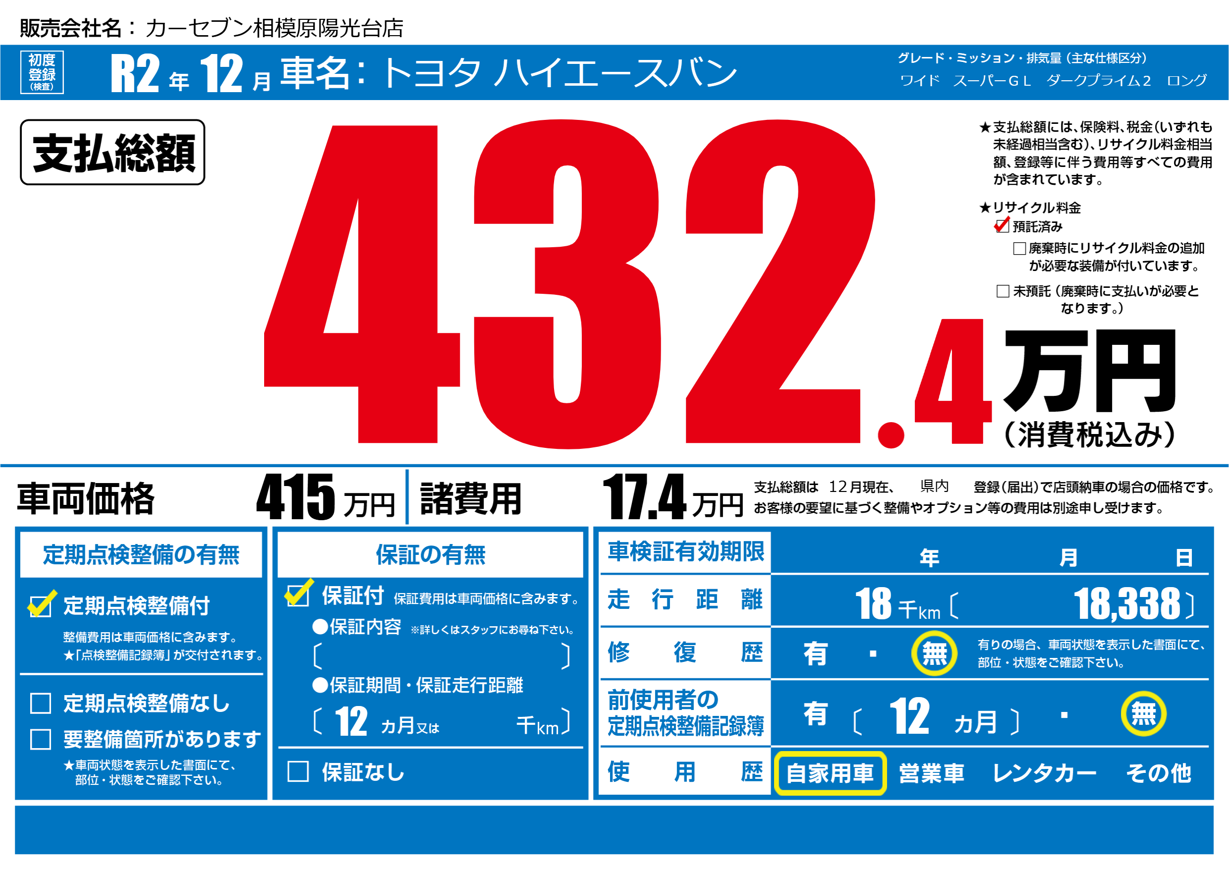 | 車名 | トヨタ ハイエースバン | グレード ミッション 排気量 |
