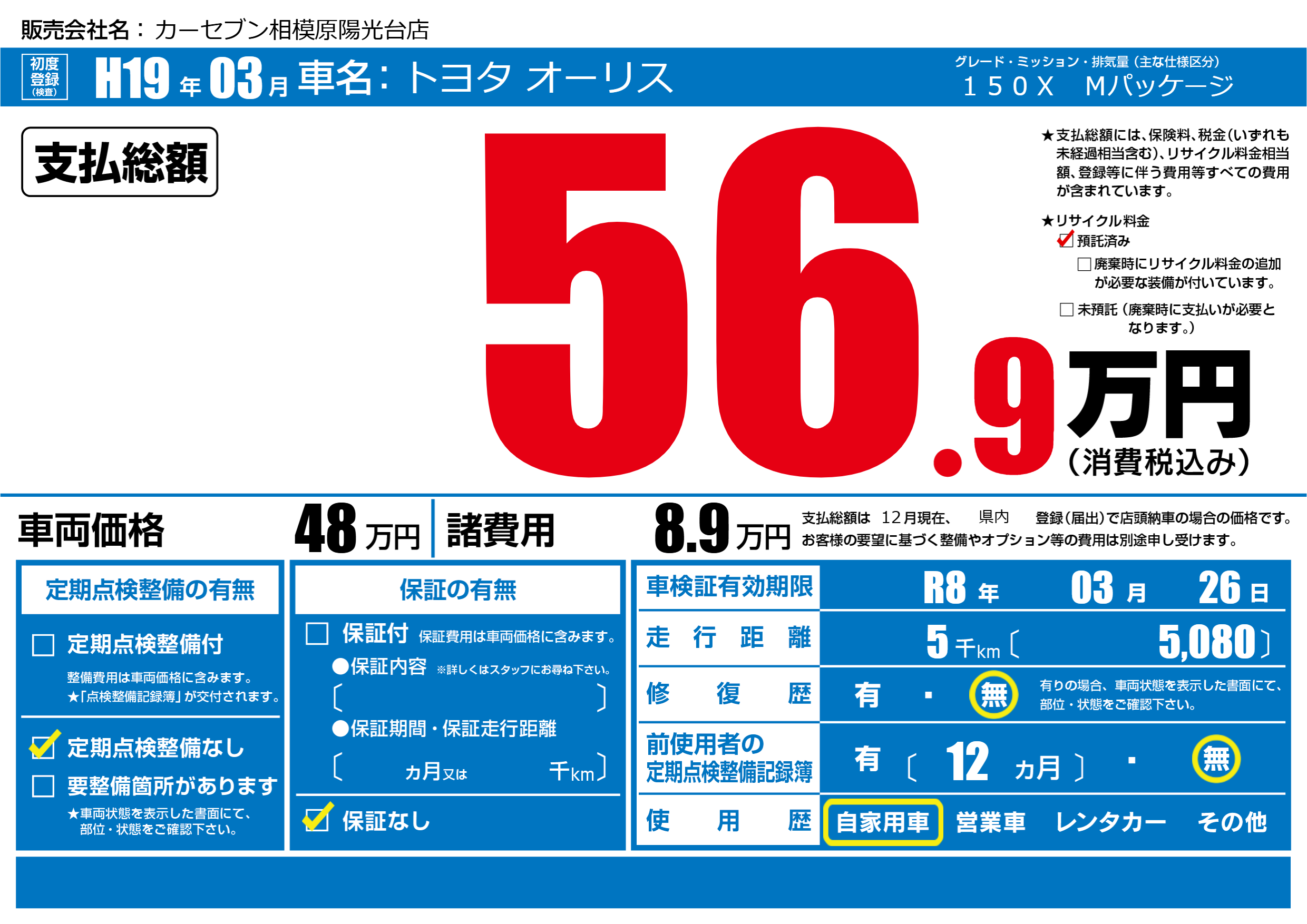 | 走行キロ | 0.5万km | 初年度登録 | H19年03月 |