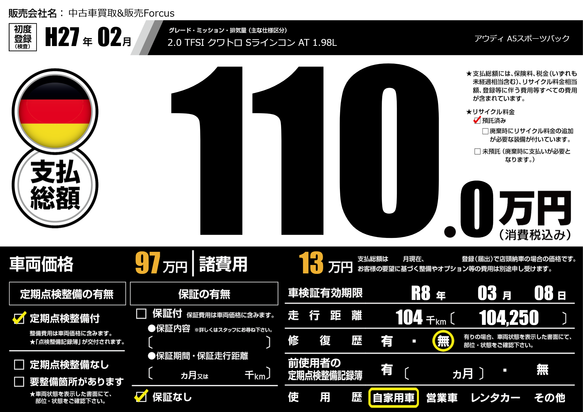 | 車名 | アウディ A5スポーツバック | グレード ミッション 排気量 |