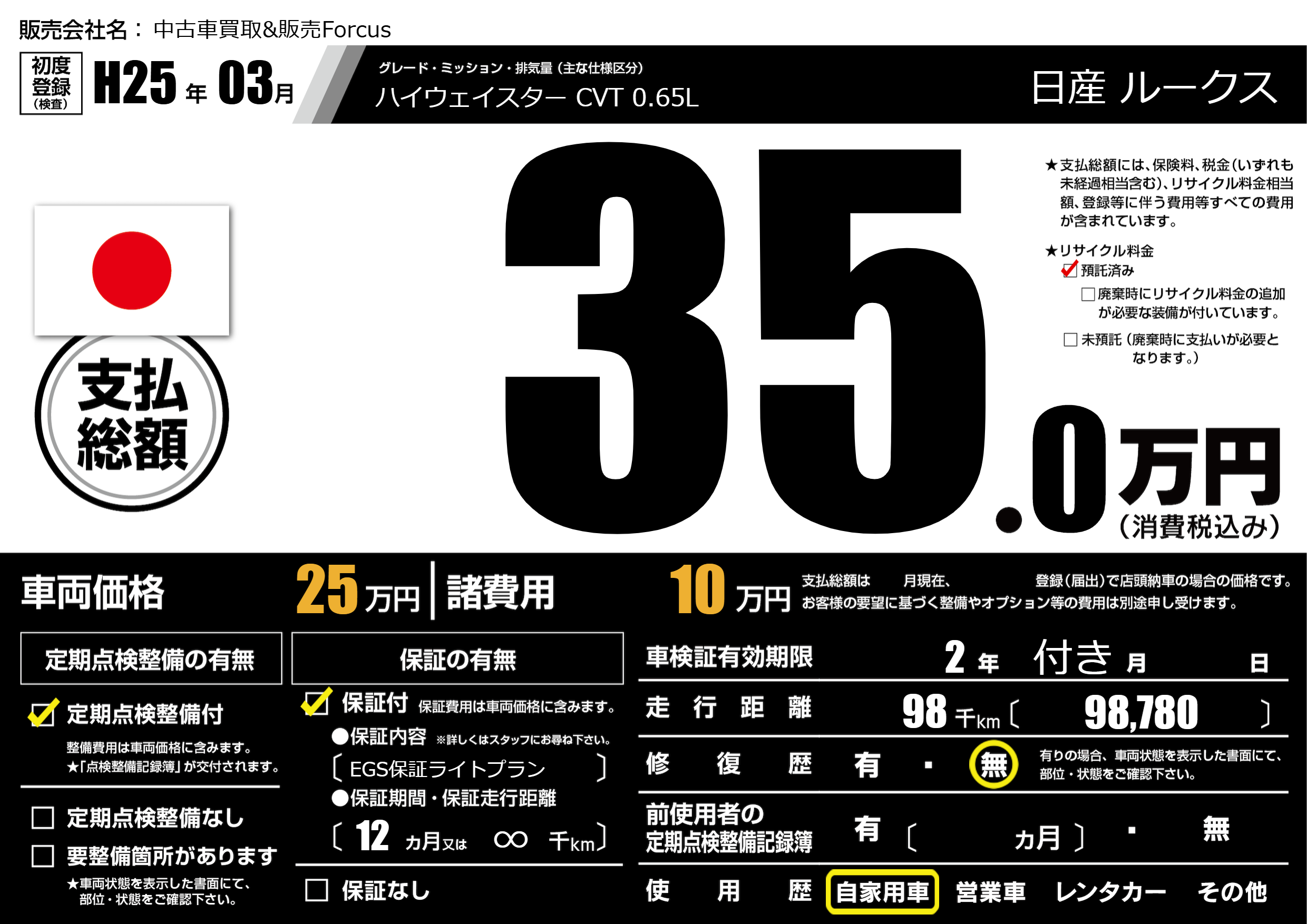 | 走行キロ | 9.8万km | 初年度登録 | H25年03月 |