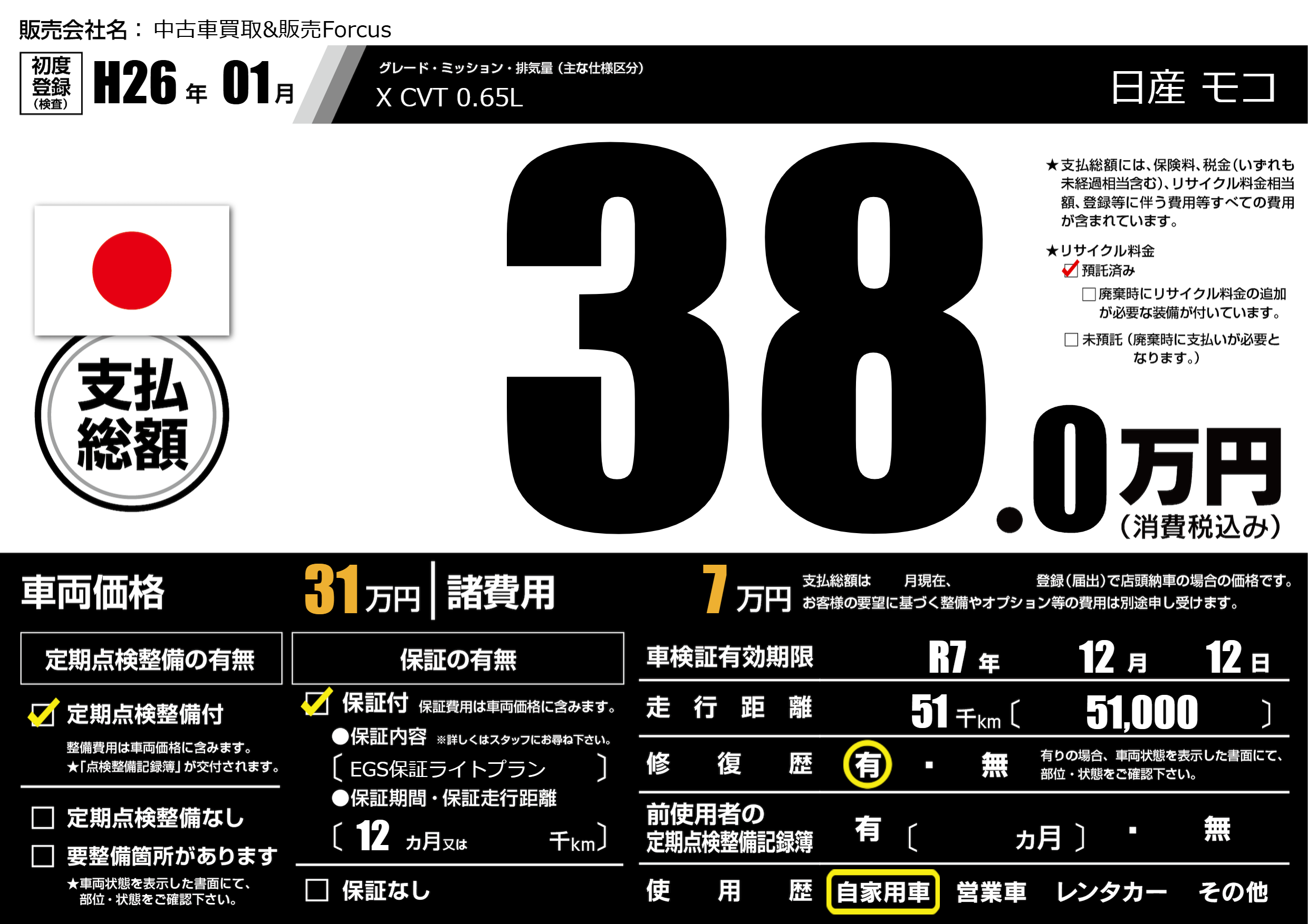 | 車名 | 日産 モコ | グレード ミッション 排気量 |