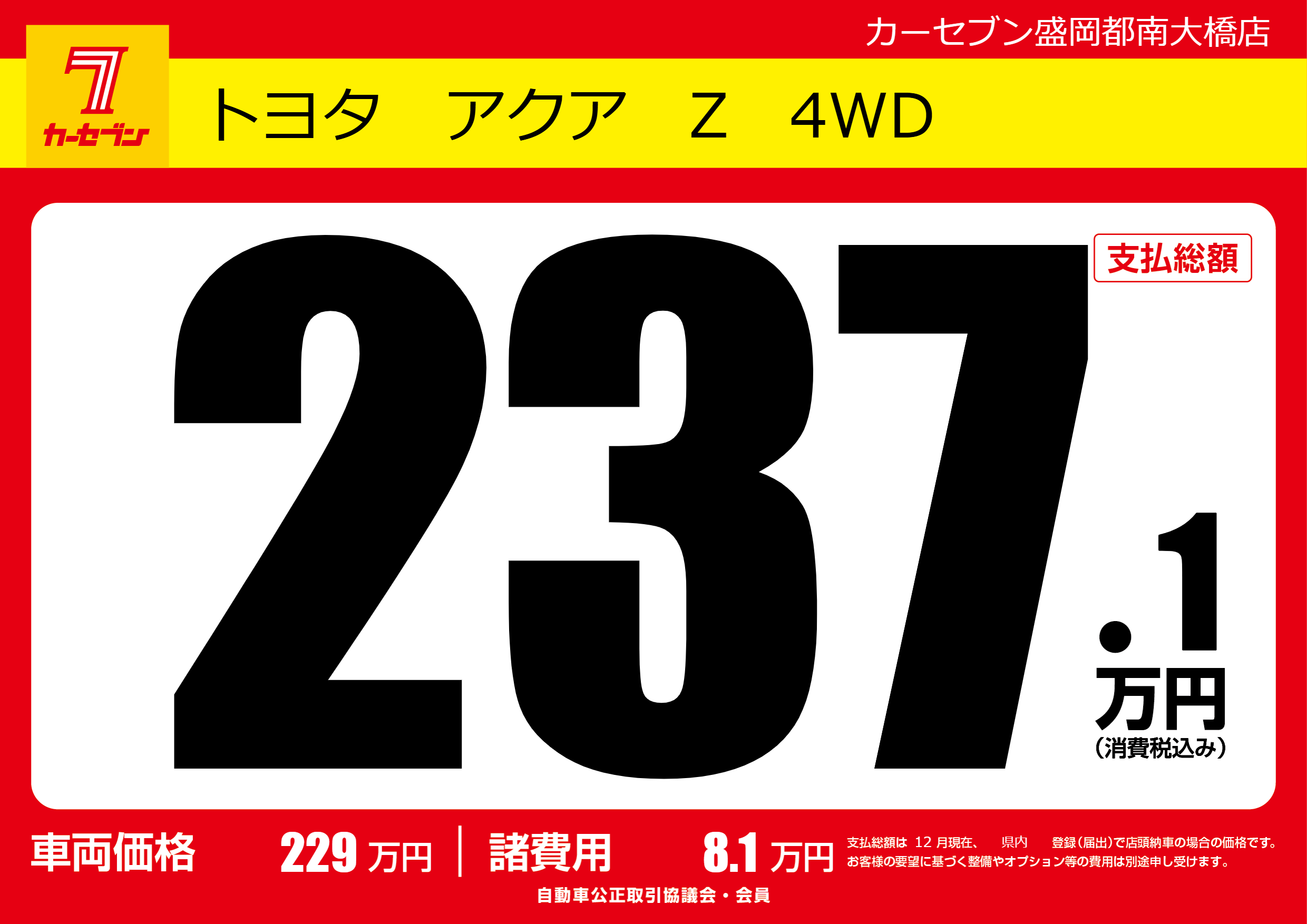 | 車名 | トヨタ アクア Z 4WD | グレード ミッション 排気量 |