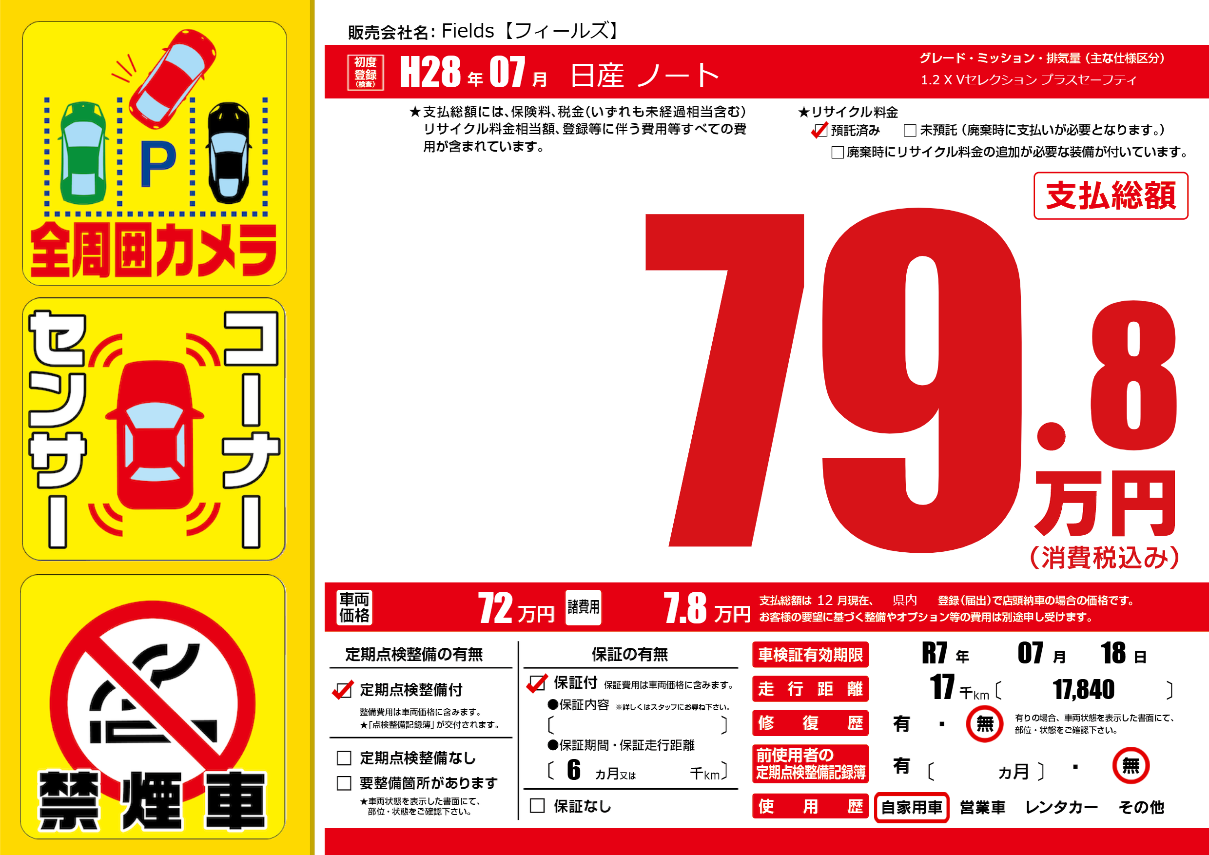 | 車名 | 日産 ノート | グレード ミッション 排気量 |
