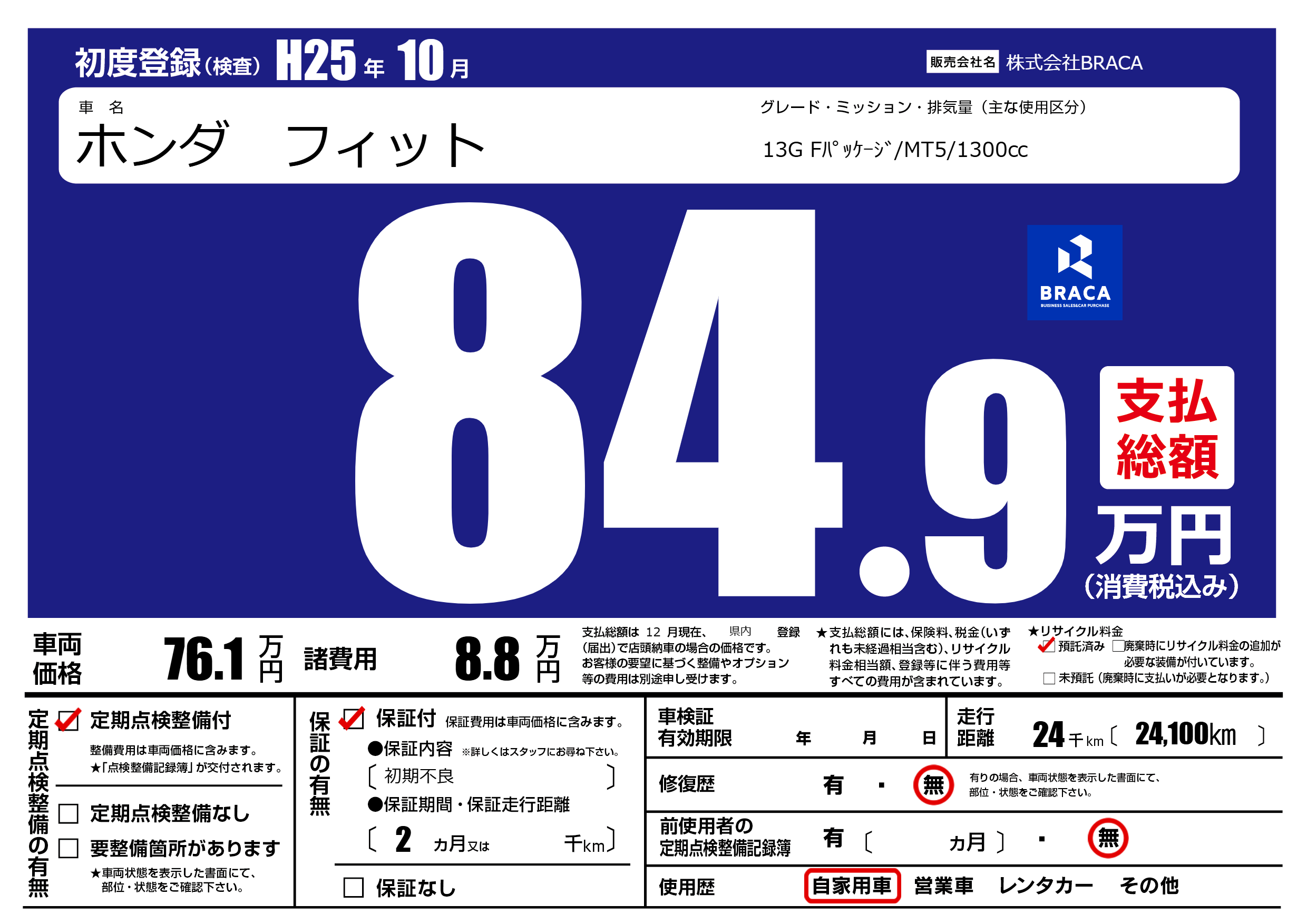 | 走行キロ | 2.4万km | 初年度登録 | H25年10月 |