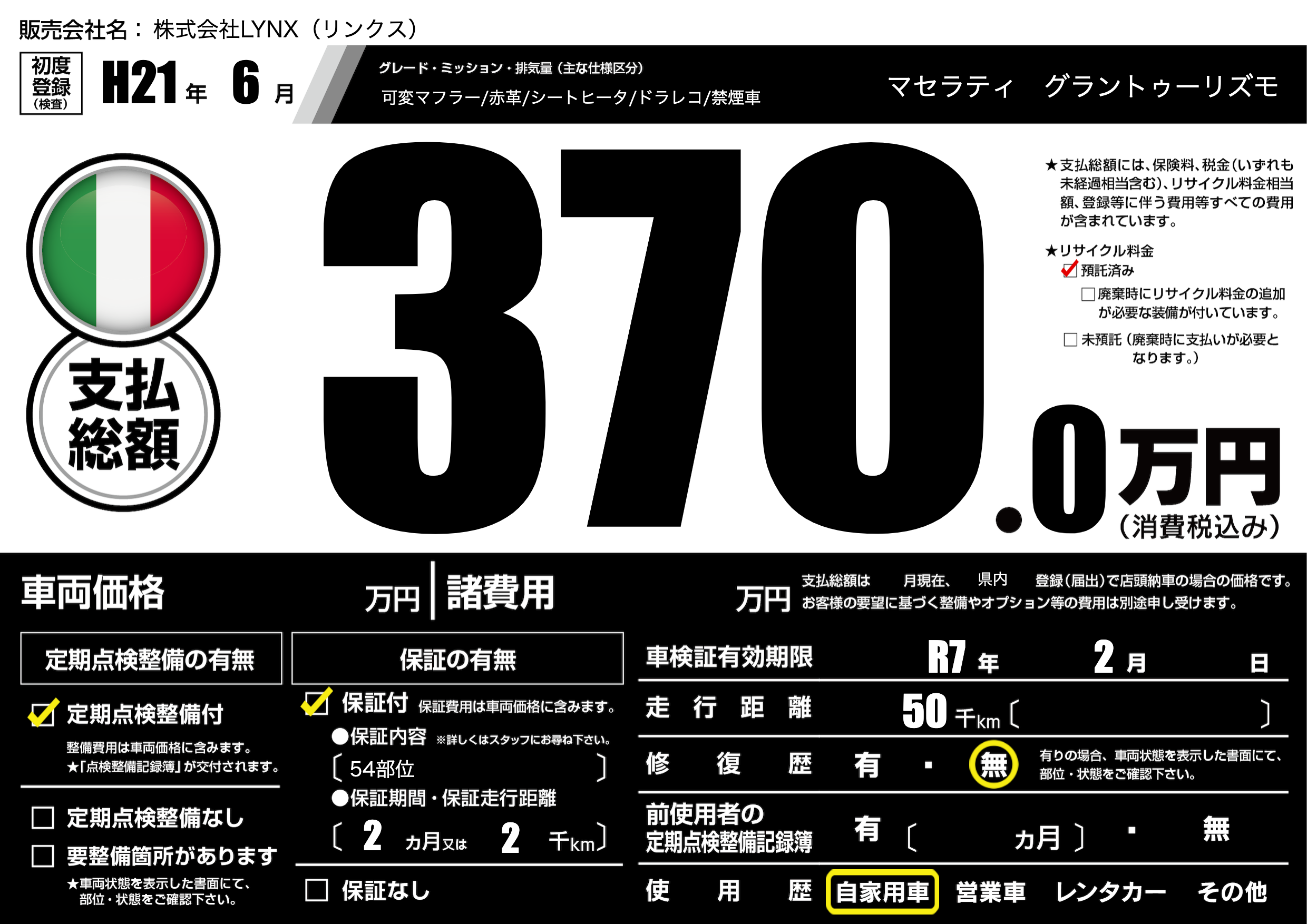 | 走行キロ | 5万km | 初年度登録 | H21年6月 |