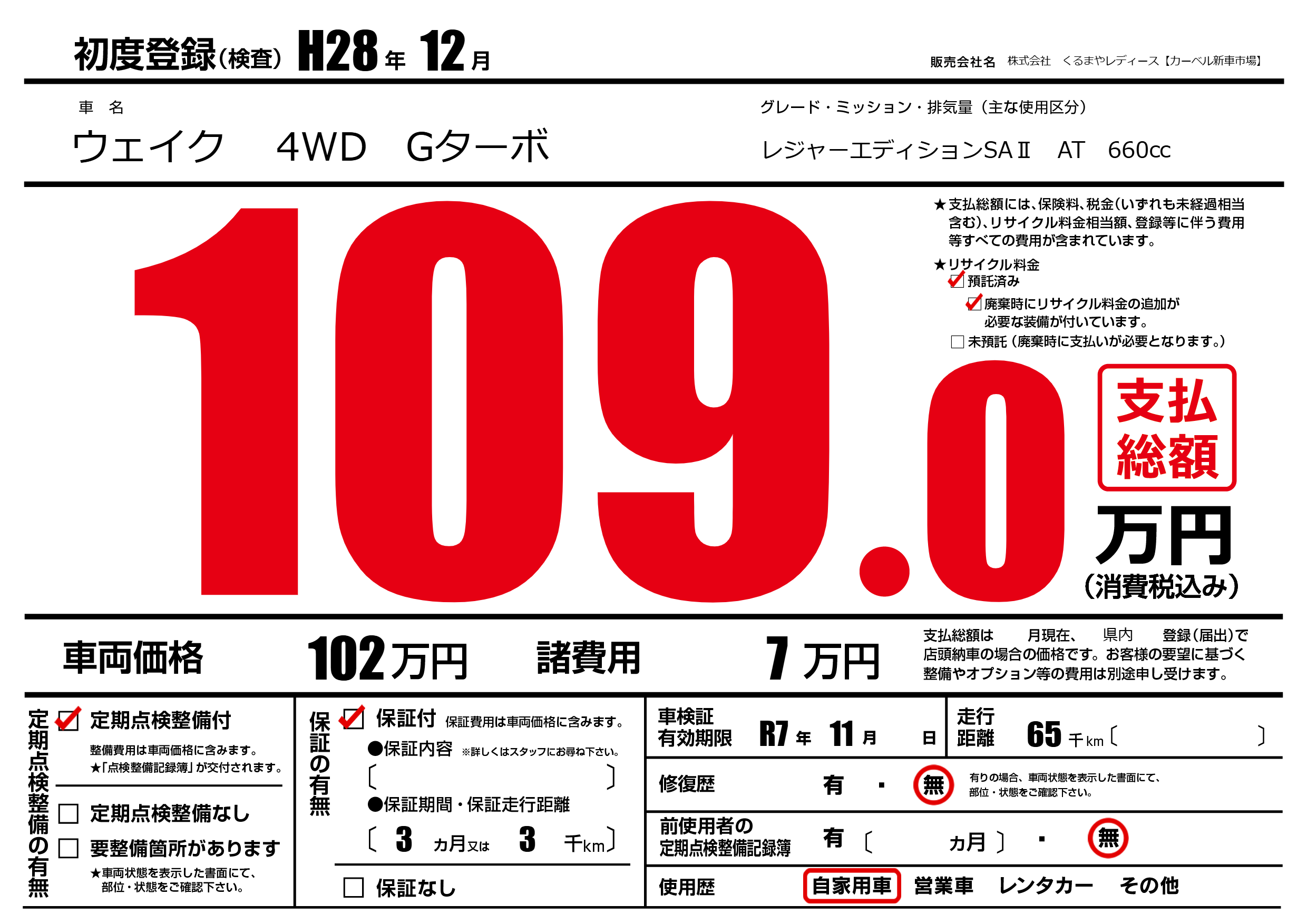 | 車名 | ウェイク 4WD Gターボ | グレード ミッション 排気量 |