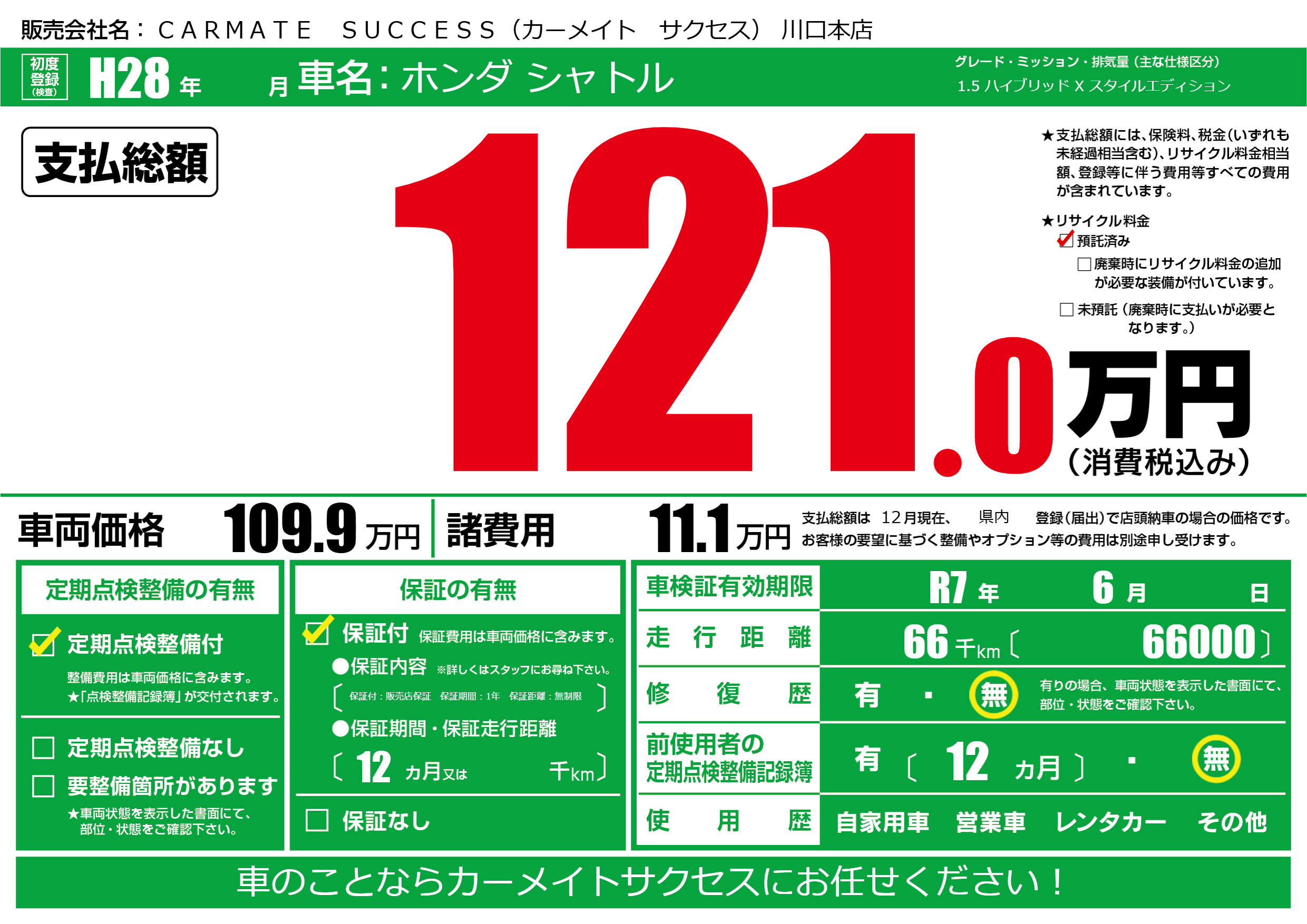 保証なし 保証内容(保証付:販売店保証 保証期間:1年 保証距離:無制限) 12ヶ月または()千kmまで |