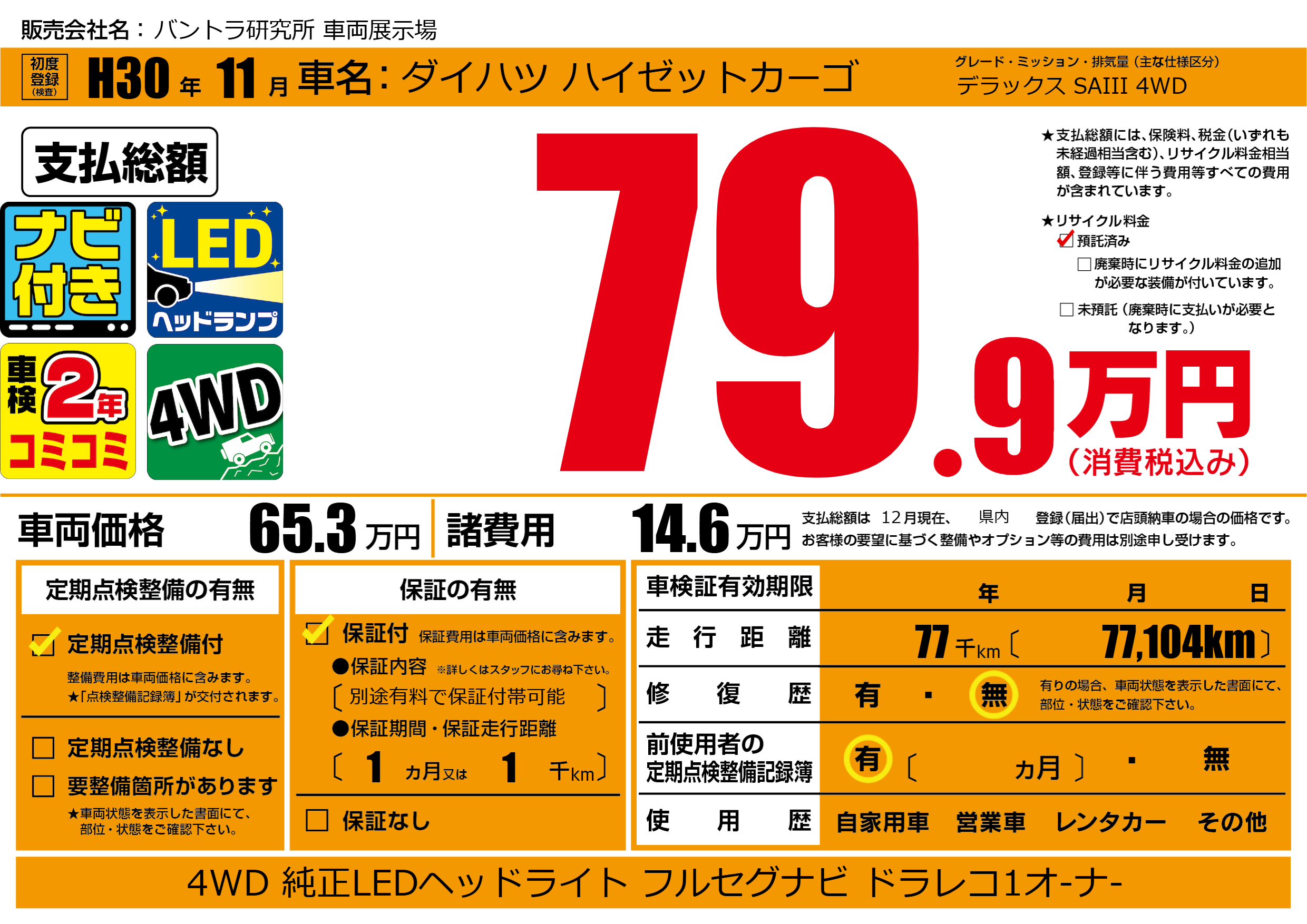 | 走行キロ | 7.7万km | 初年度登録 | H30年11月 |