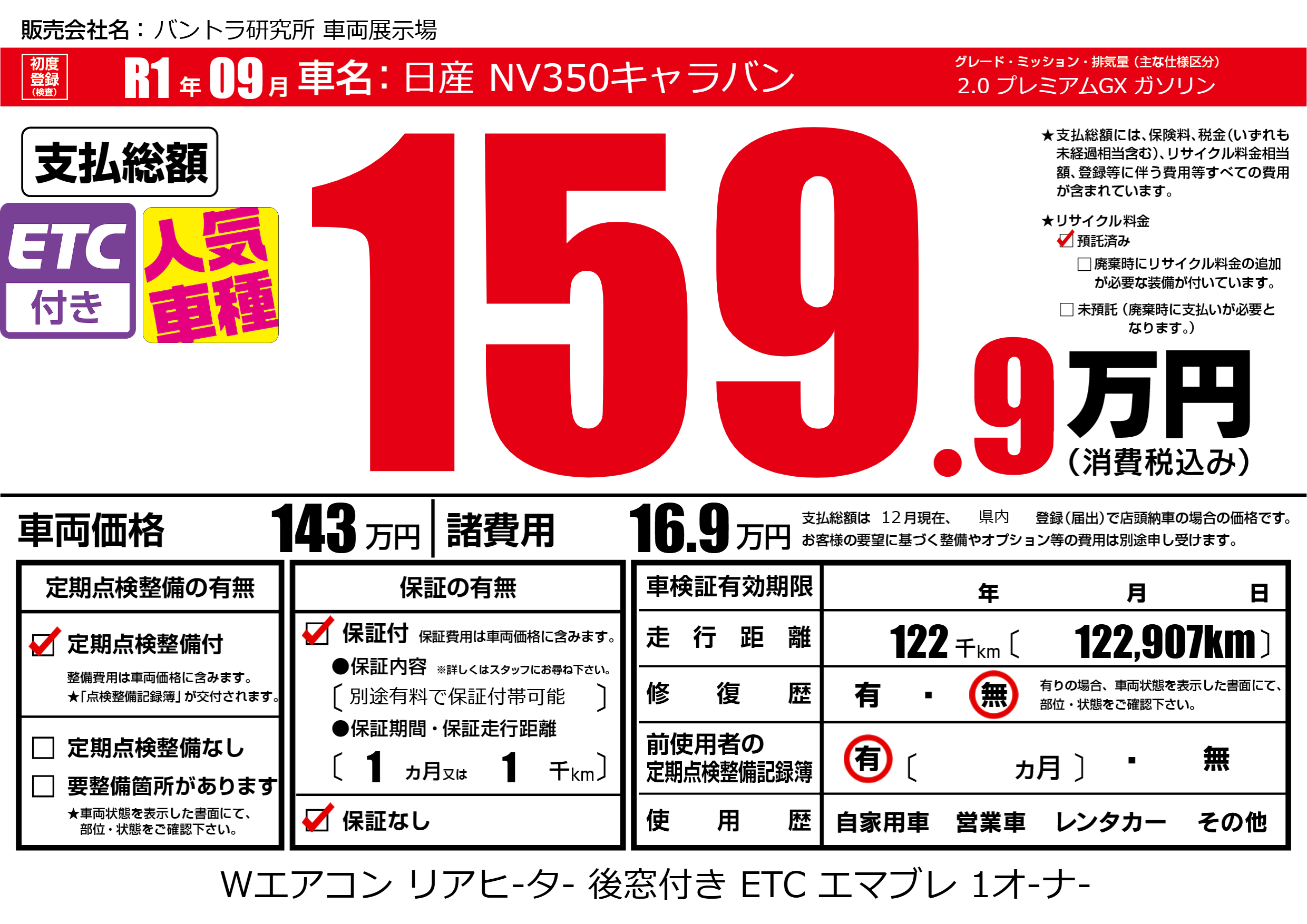 | 車名 | 日産 NV350キャラバン | グレード ミッション 排気量 |