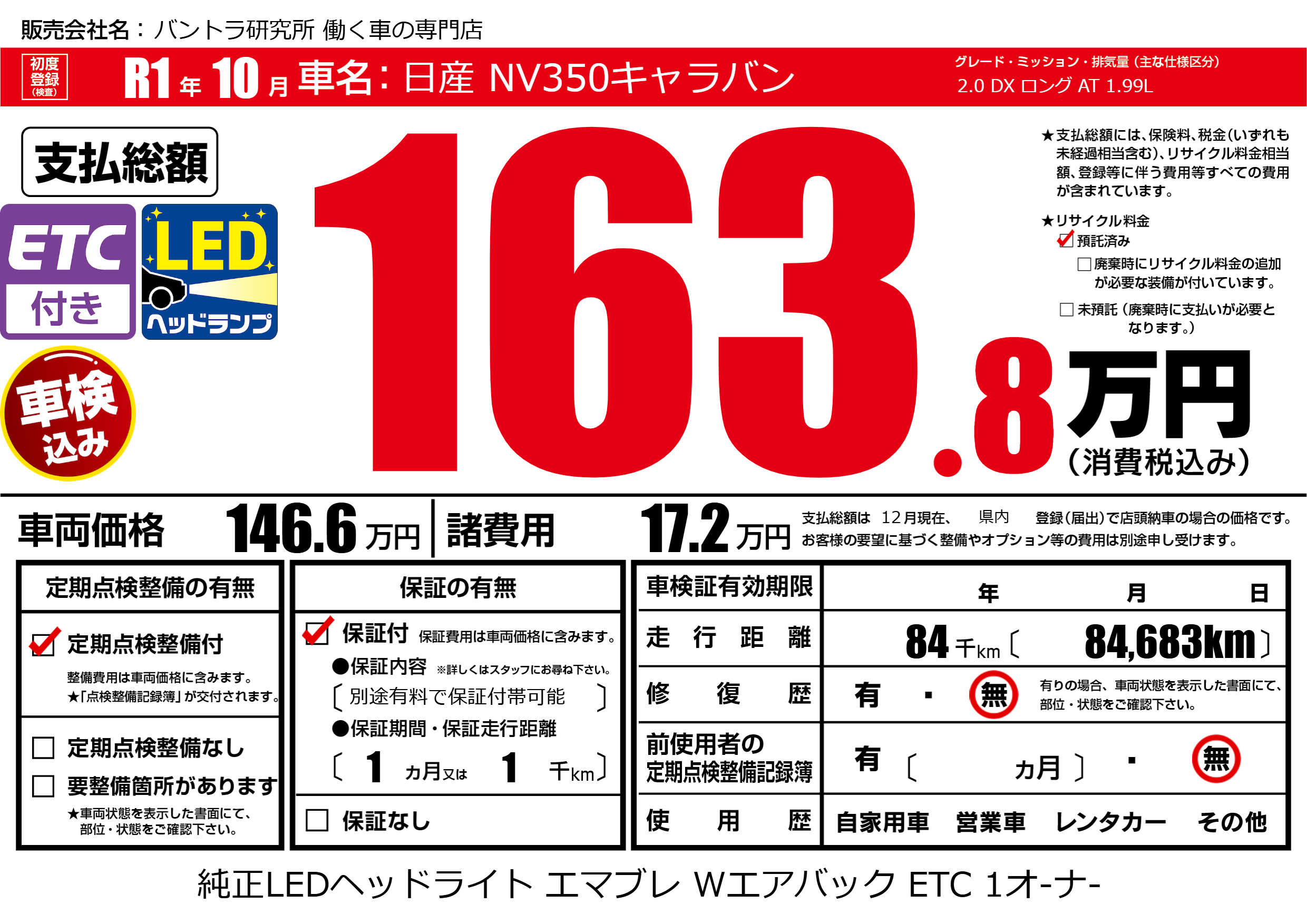 | 車名 | 日産 NV350キャラバン | グレード ミッション 排気量 |