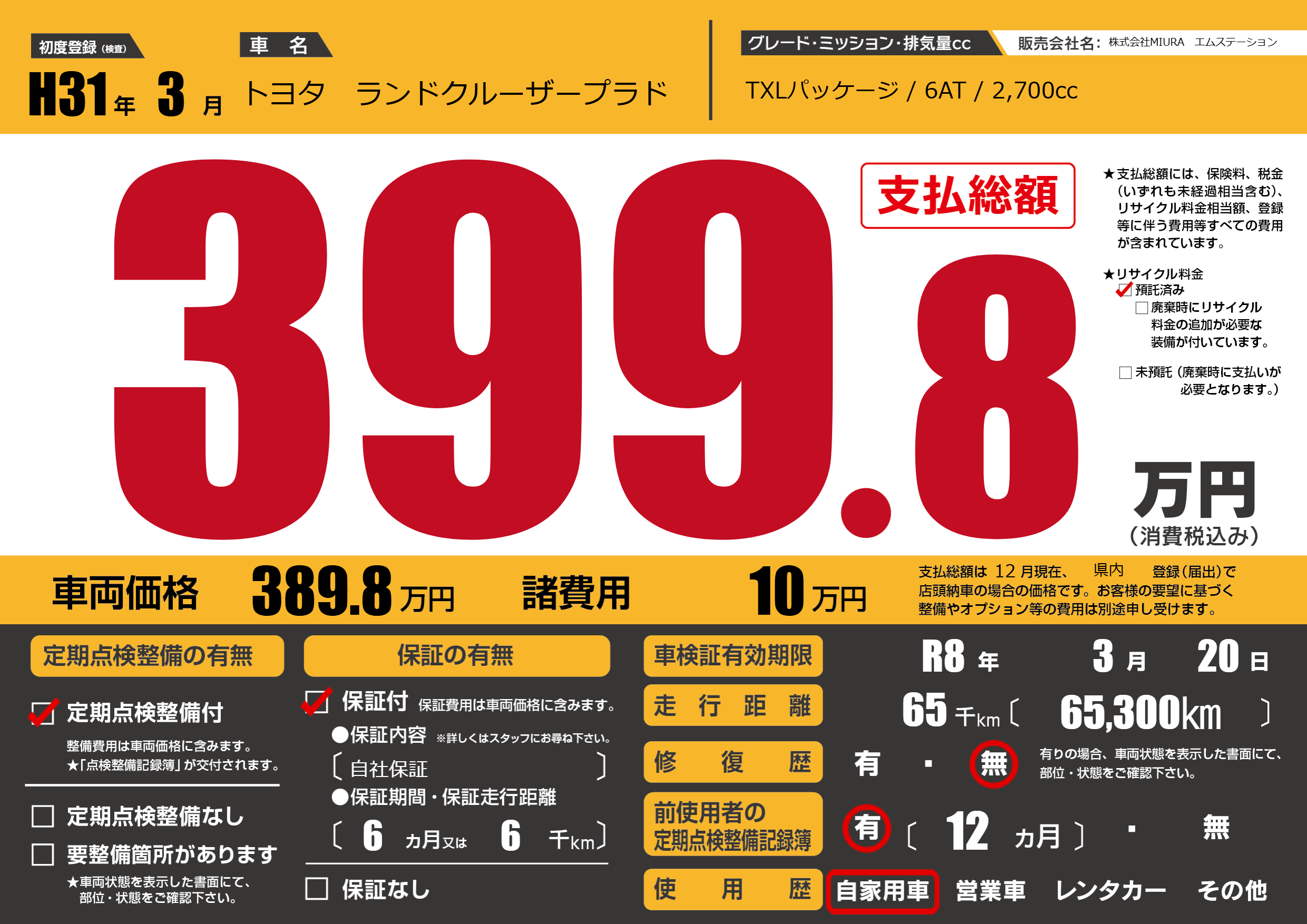| 車名 | トヨタ ランドクルーザープラド | グレード ミッション 排気量 |