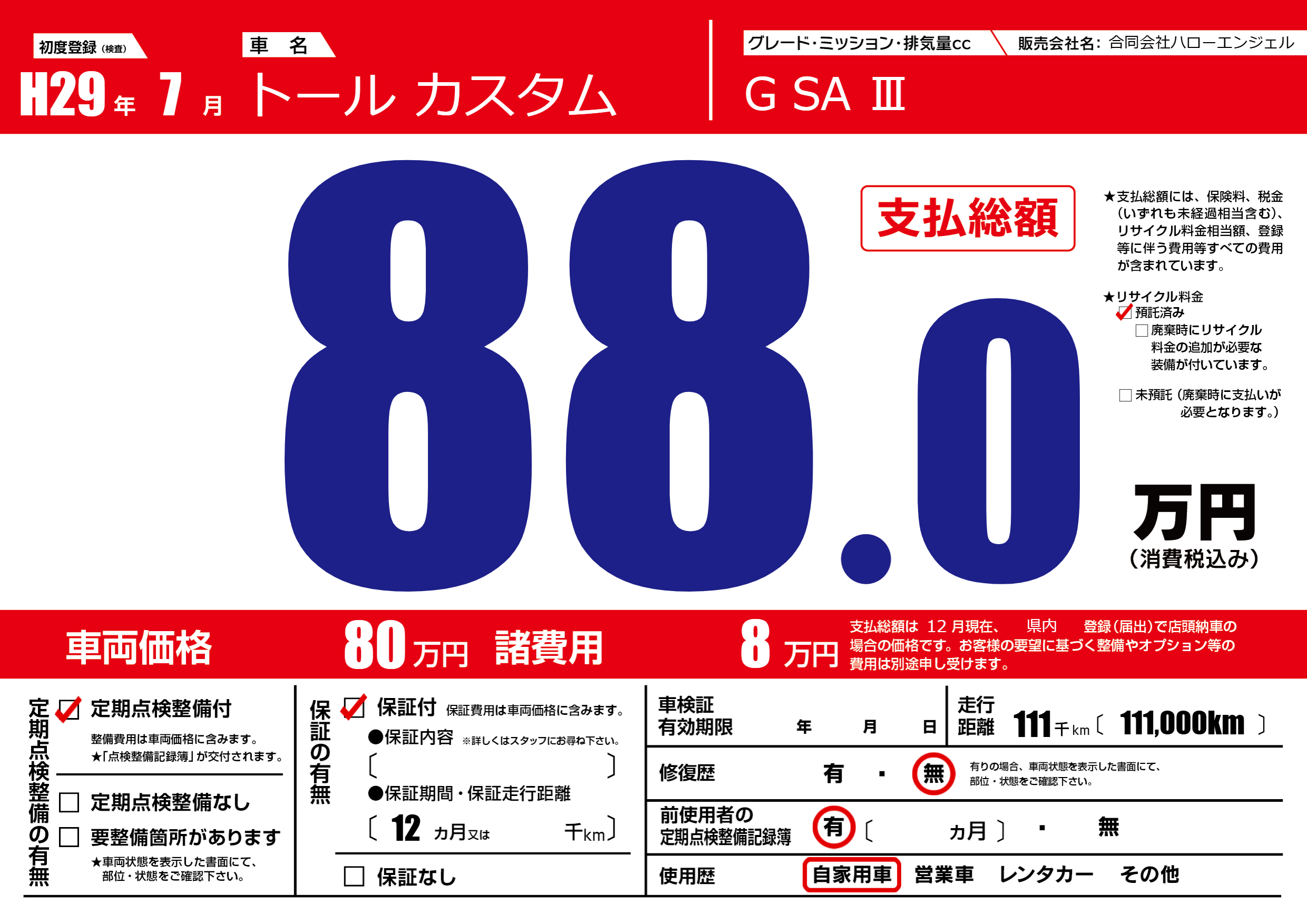 | 走行キロ | 11.1万km | 初年度登録 | H29年7月 |