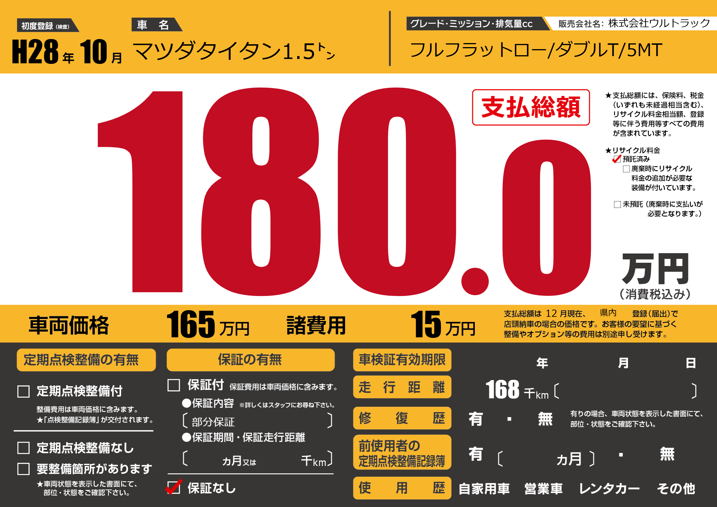 | 車名 | マツダタイタン1.5㌧ | グレード ミッション 排気量 |
