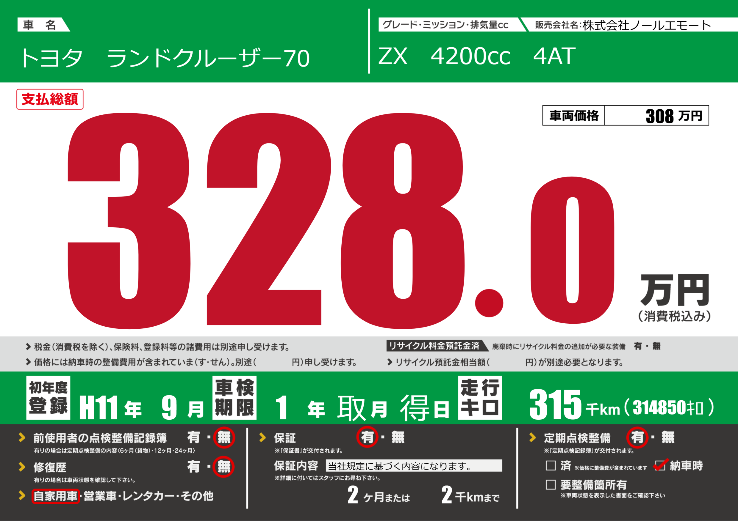 | 車名 | トヨタ ランドクルーザー70 | グレード ミッション 排気量 |