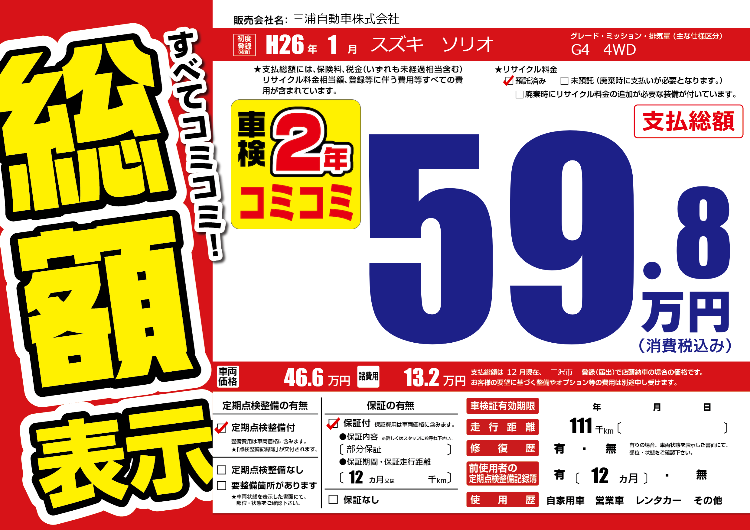 | 車名 | スズキ ソリオ | グレード ミッション 排気量 |