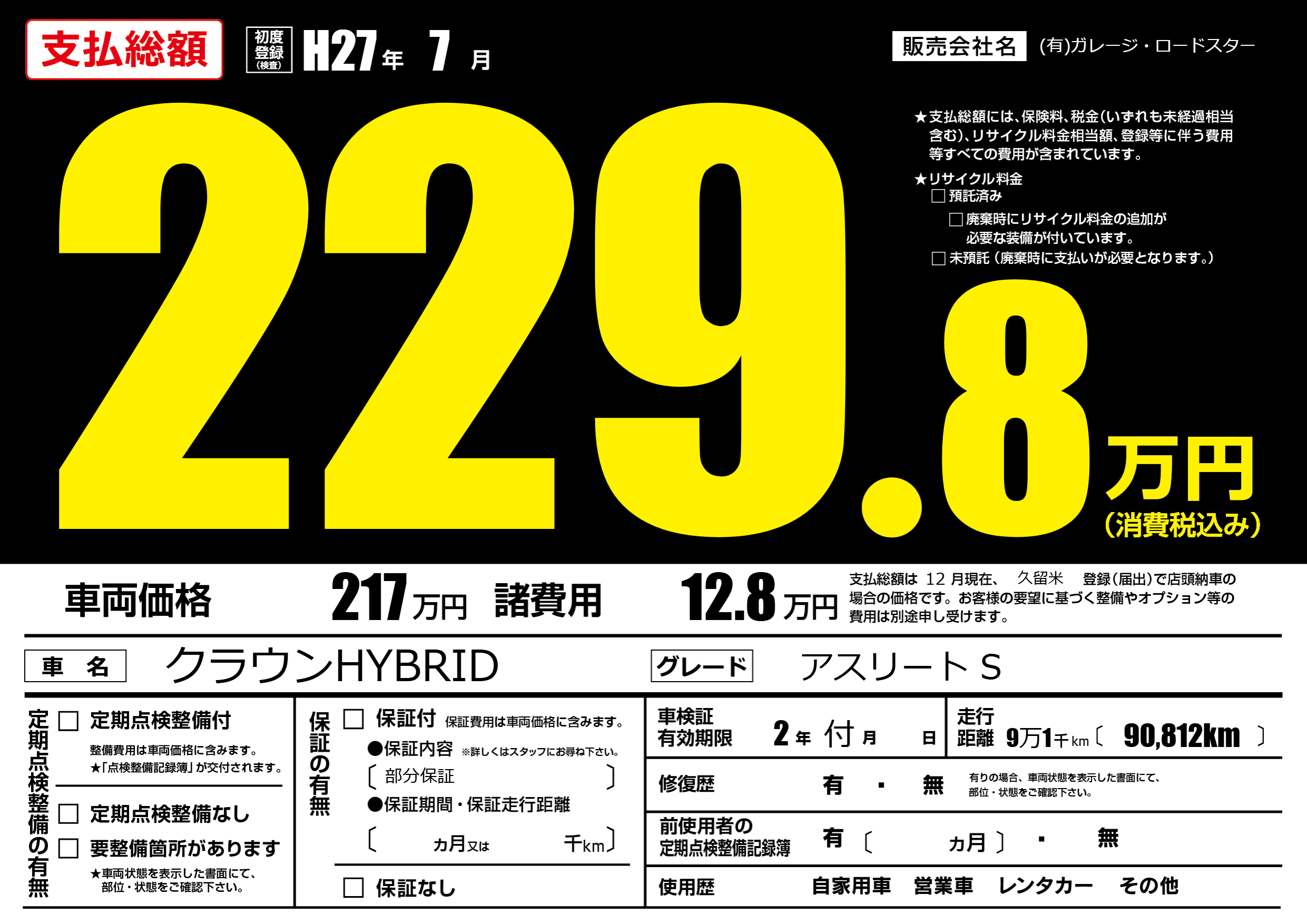 保証なし 保証内容(部分保証) ---ヶ月または()千kmまで |