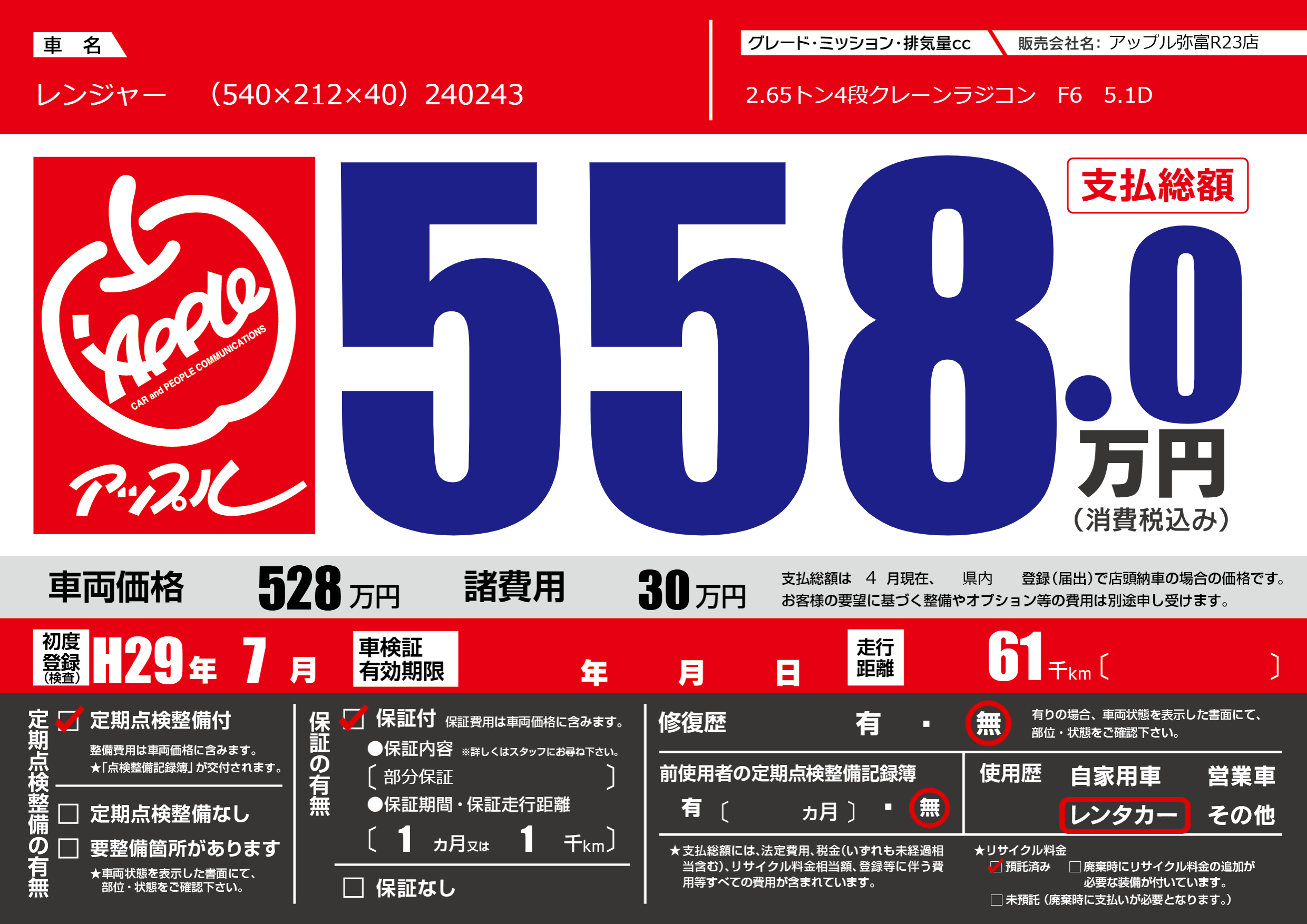 | 車名 | レンジャー (540×212×40)240243 | グレード ミッション 排気量 |