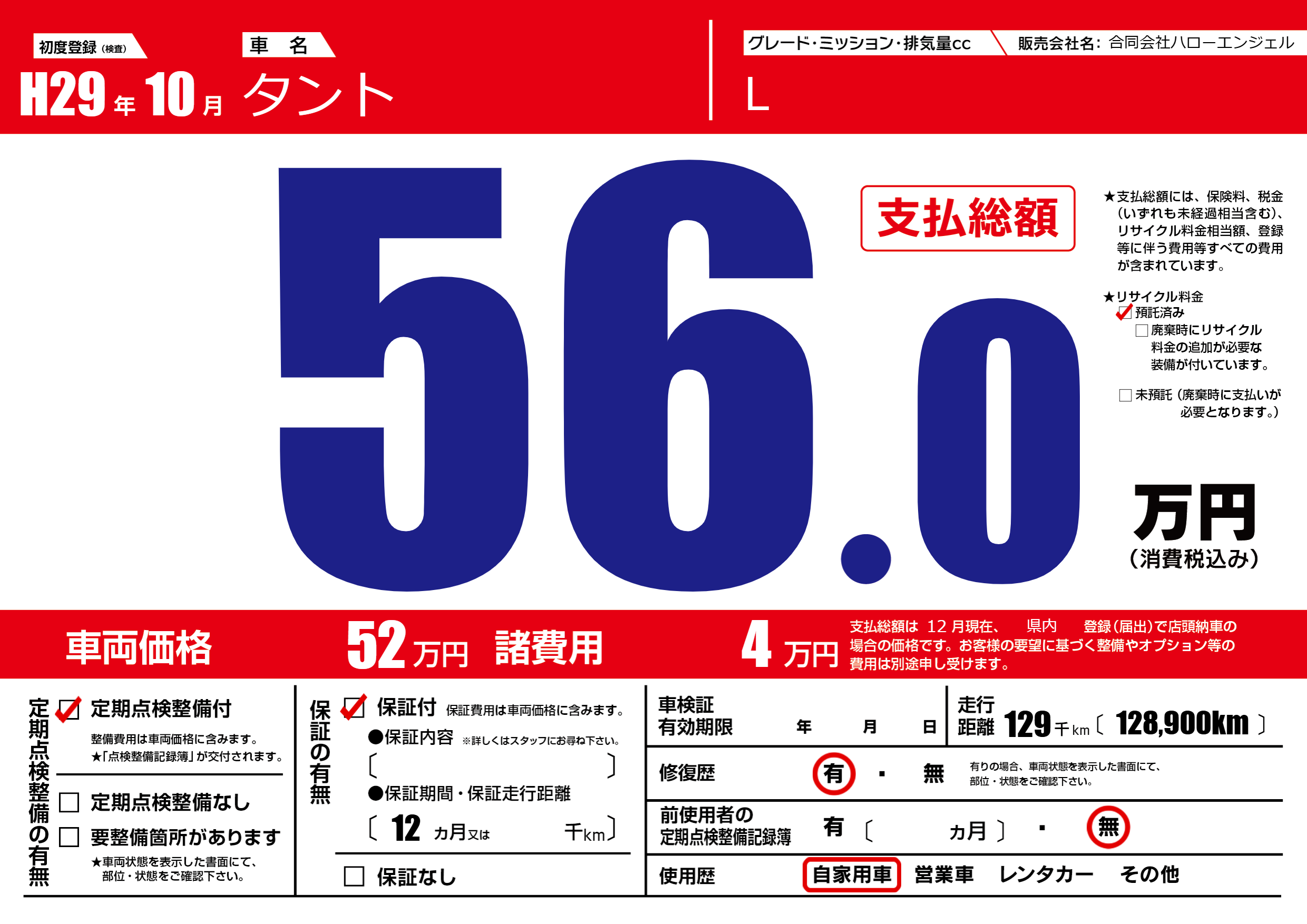 | 走行キロ | 12.9万km | 初年度登録 | H29年10月 |