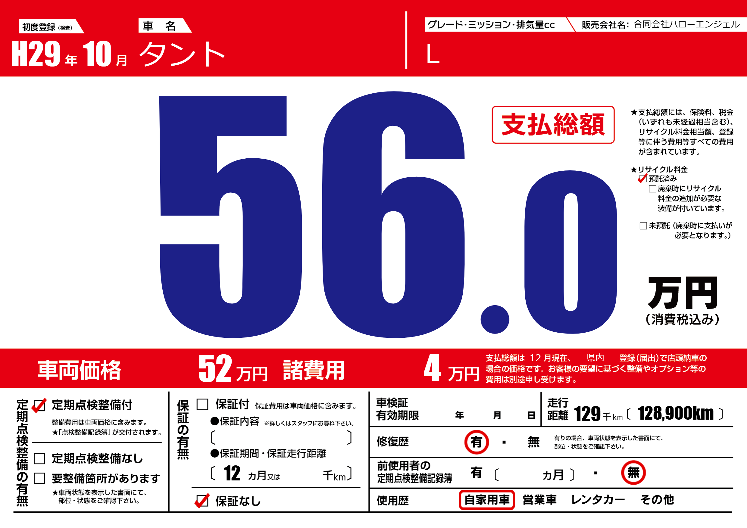 | 走行キロ | 12.9万km | 初年度登録 | H29年10月 |