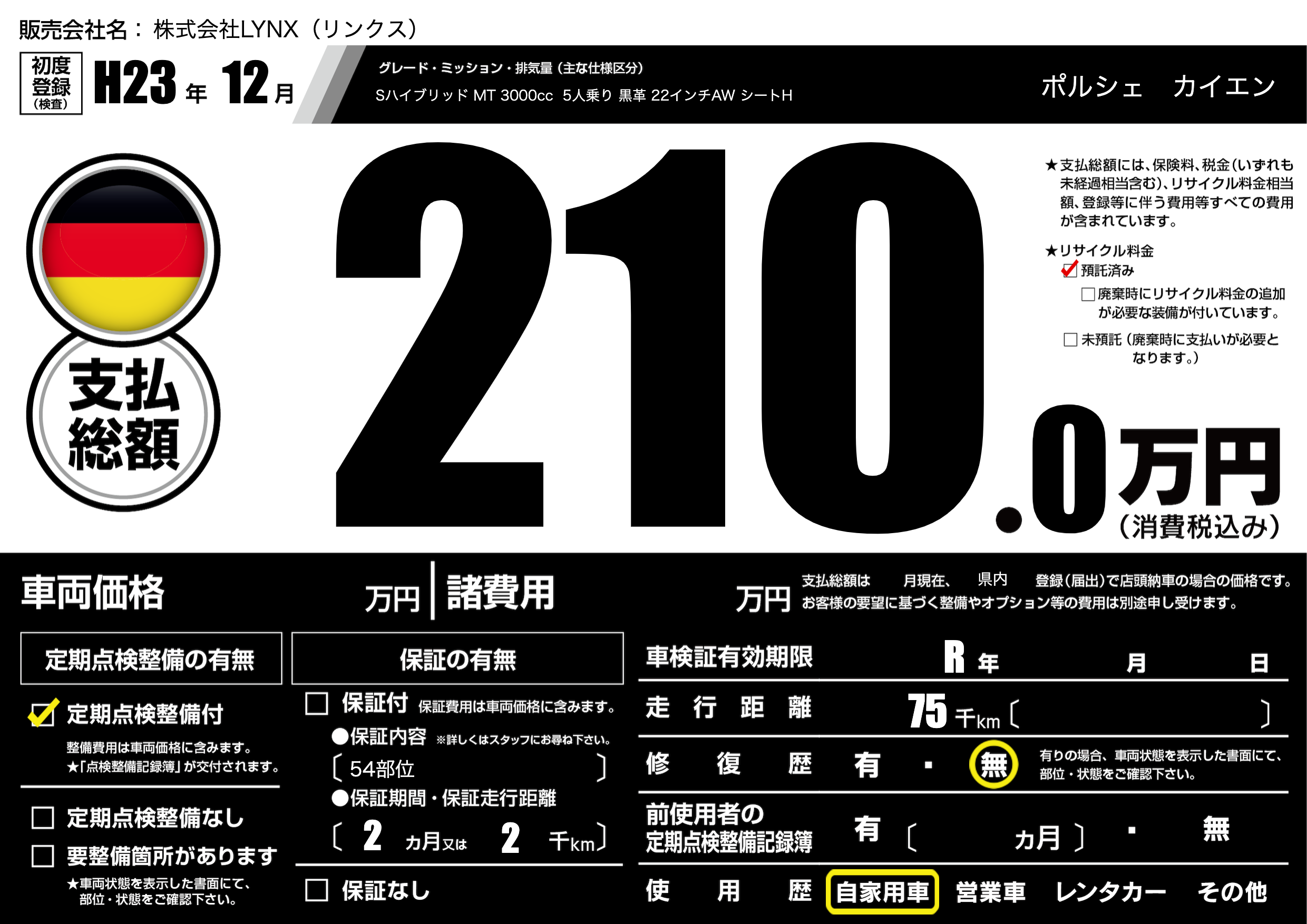 | 車名 | ポルシェ カイエン | グレード ミッション 排気量 |