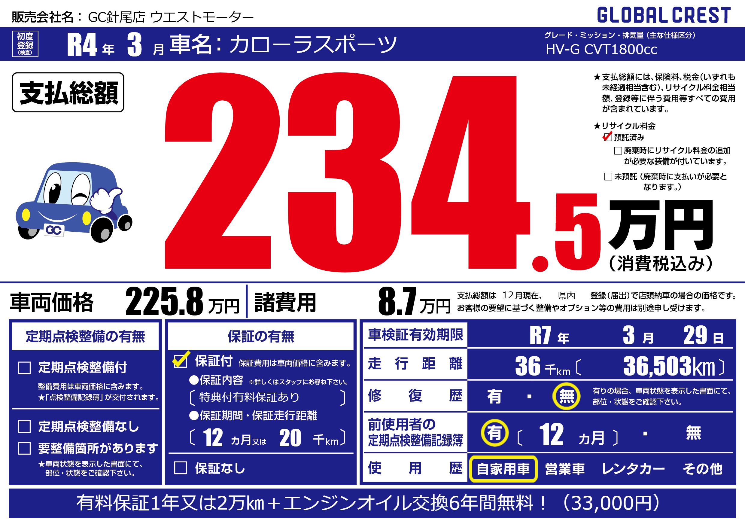 | 車名 | カローラスポーツ | グレード ミッション 排気量 |