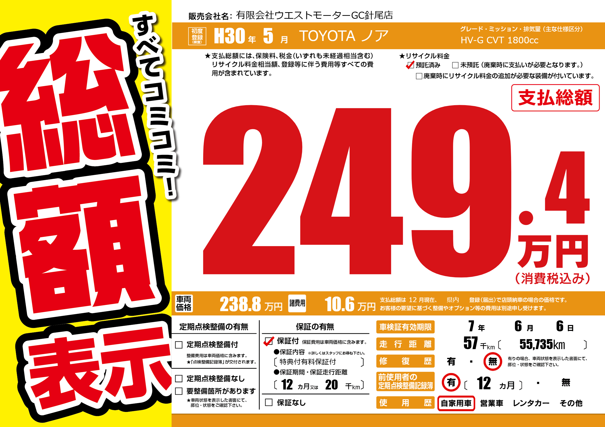 | 車名 | TOYOTA ノア | グレード ミッション 排気量 |