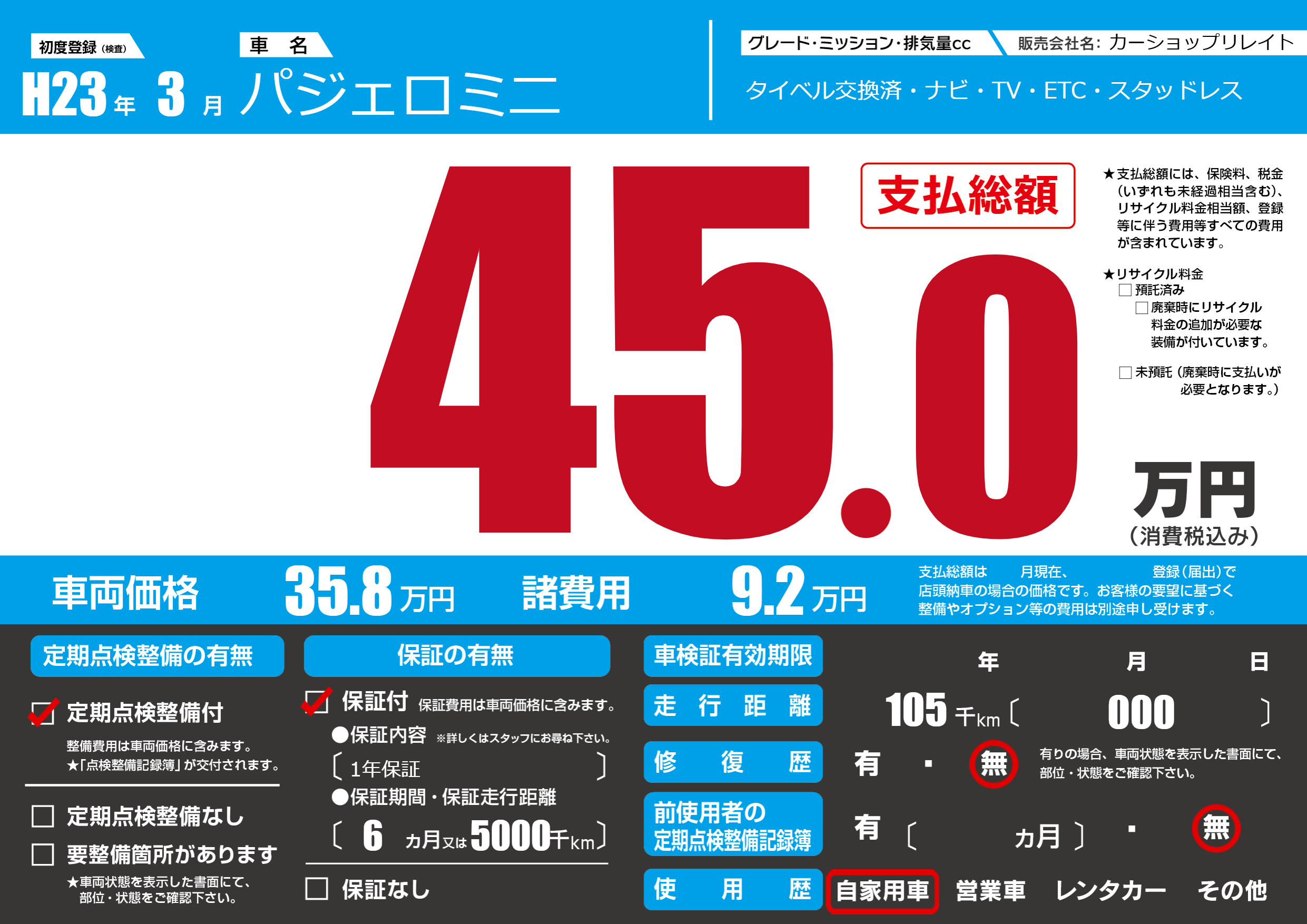 | 車検制限 | - 年 - 月 - 日 | ||