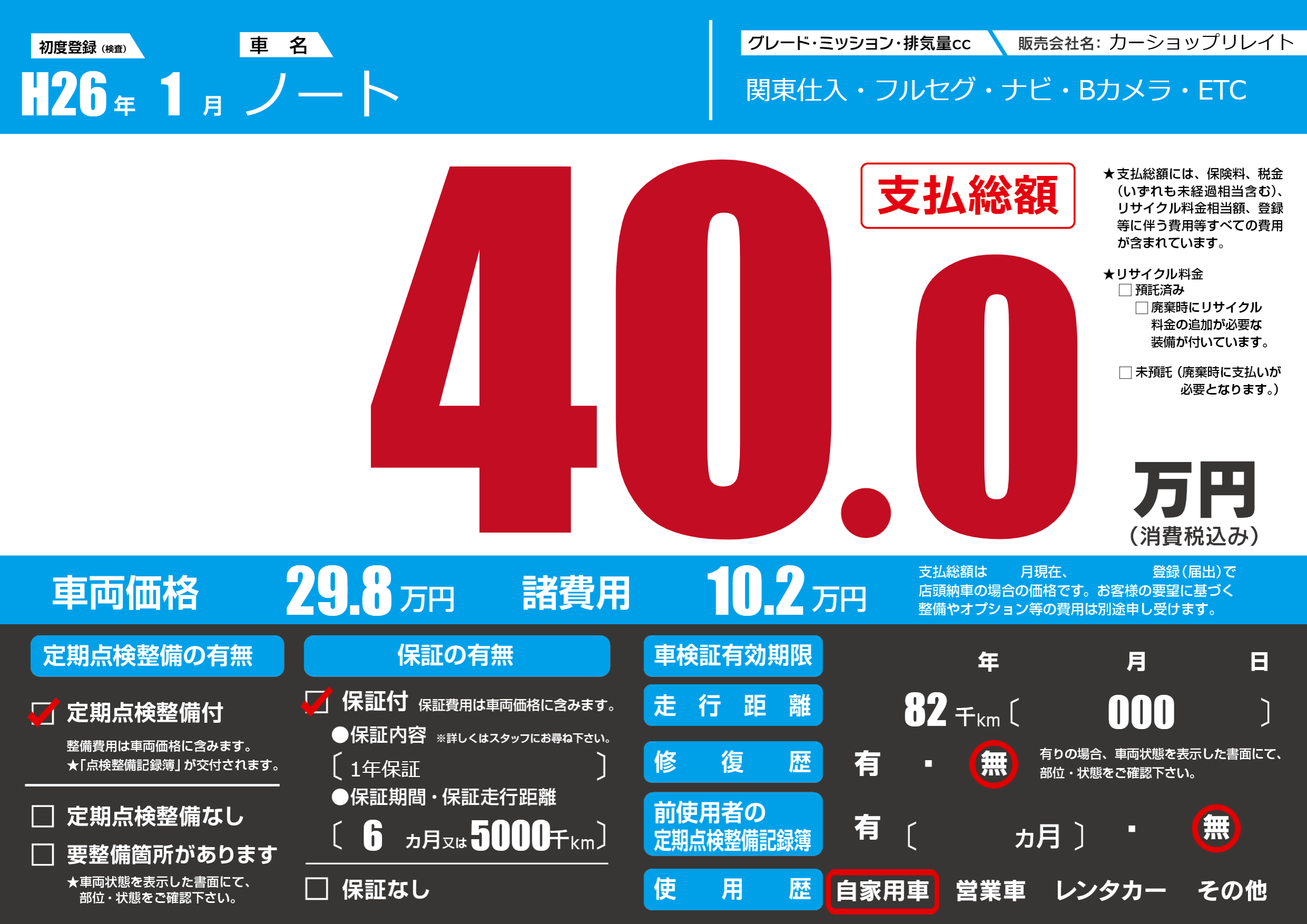 | 走行キロ | 8.2万km | 初年度登録 | H26年1月 |