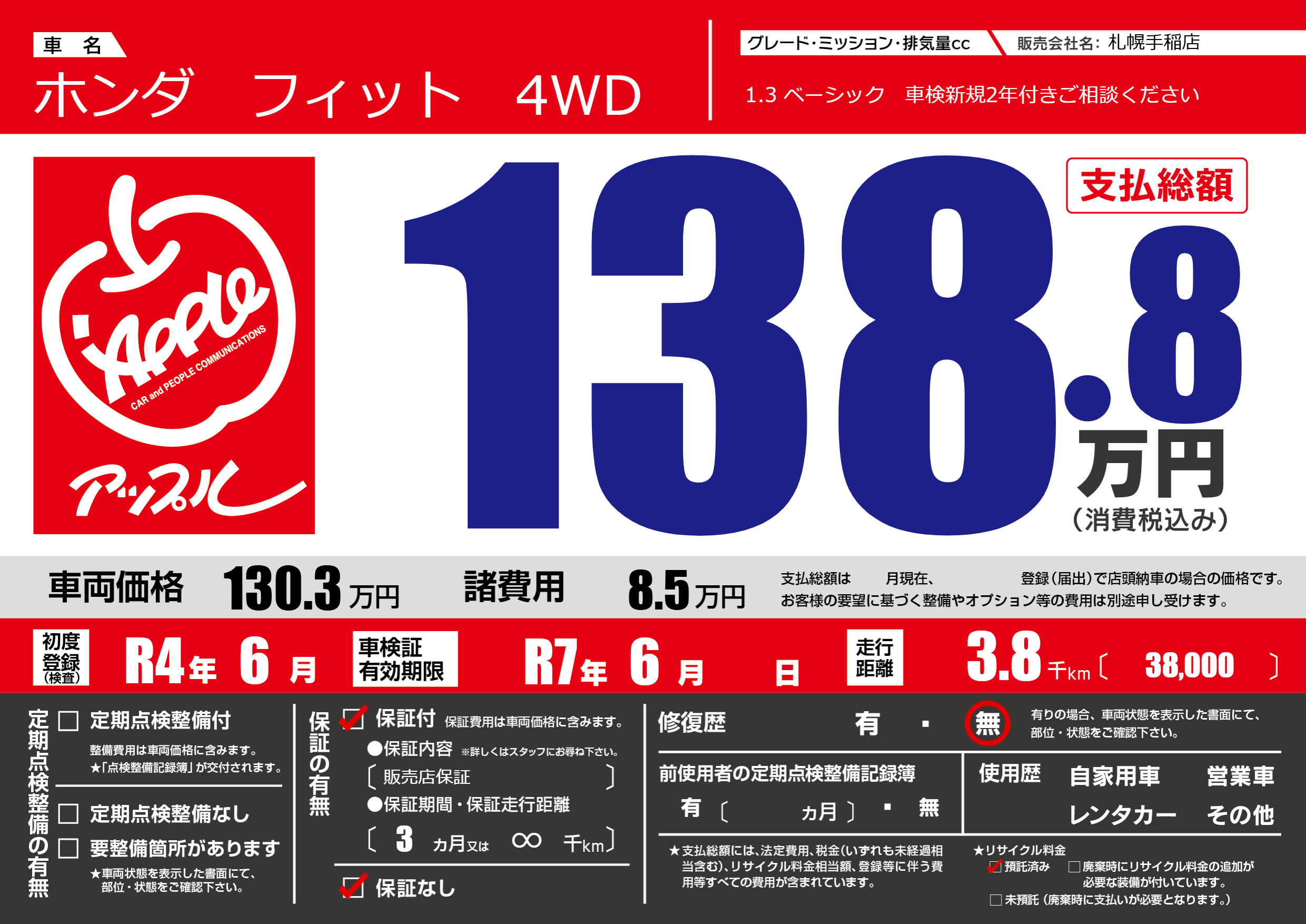 | 車名 | ホンダ フィット 4WD | グレード ミッション 排気量 |