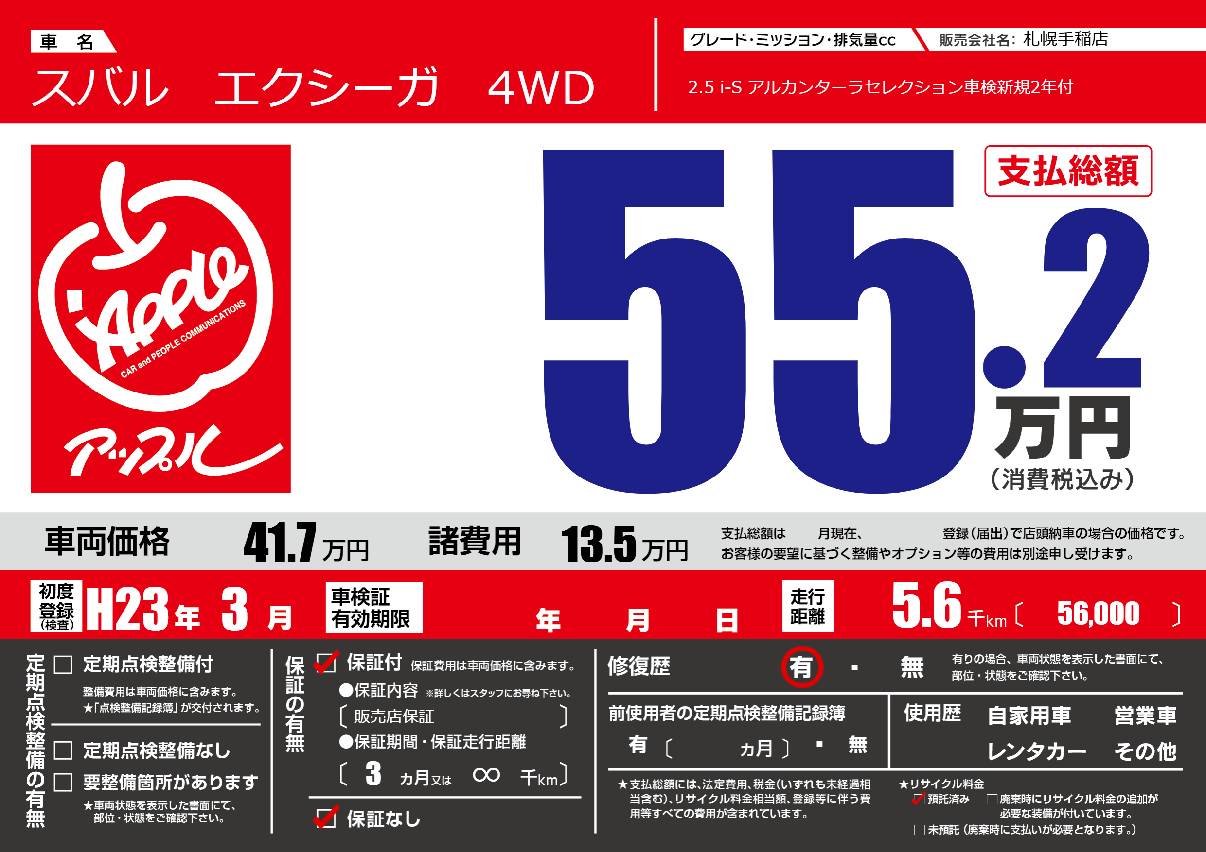 | 車名 | スバル エクシーガ 4WD | グレード ミッション 排気量 |