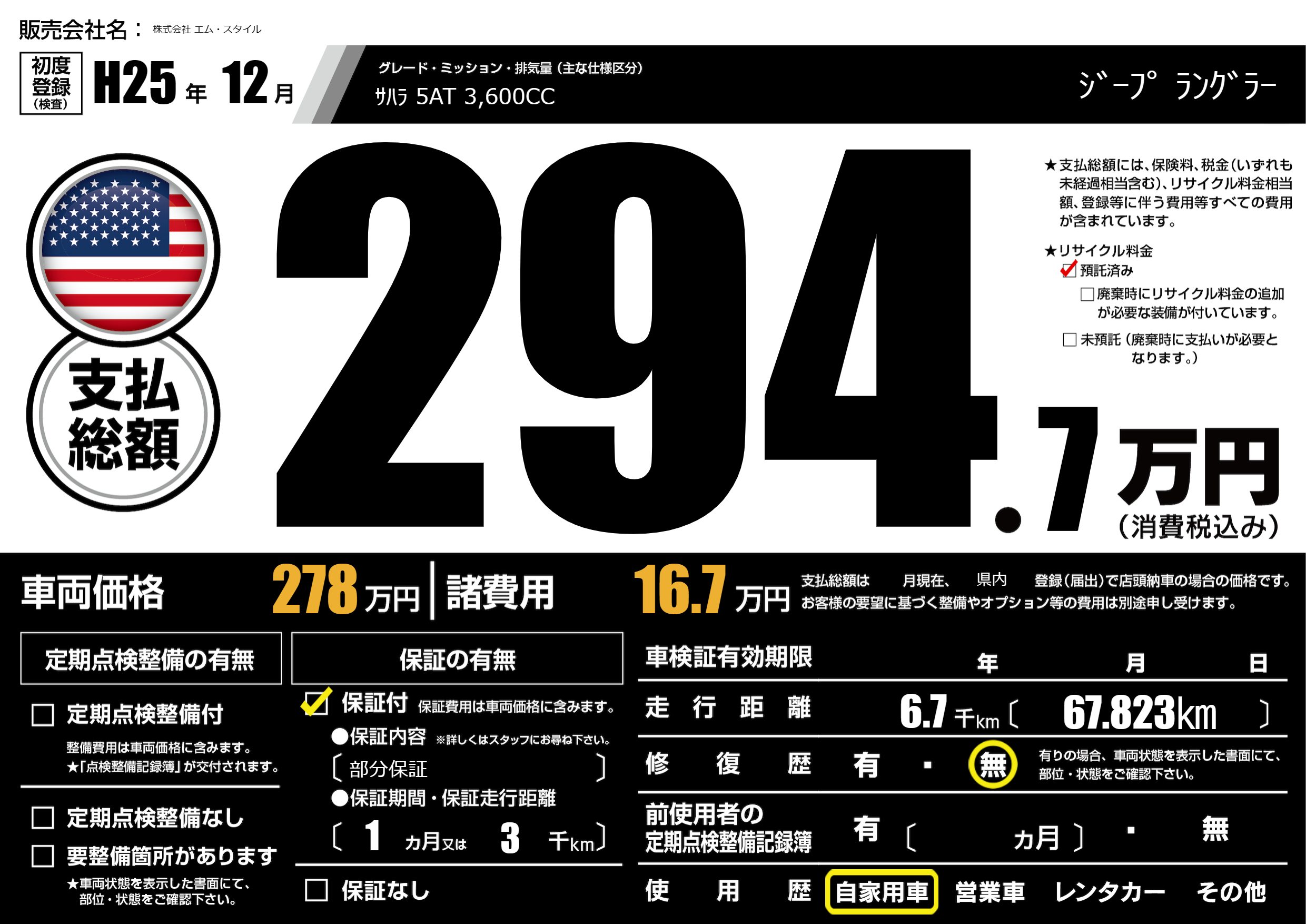 | 車名 | ジープ ラングラー | グレード ミッション 排気量 |