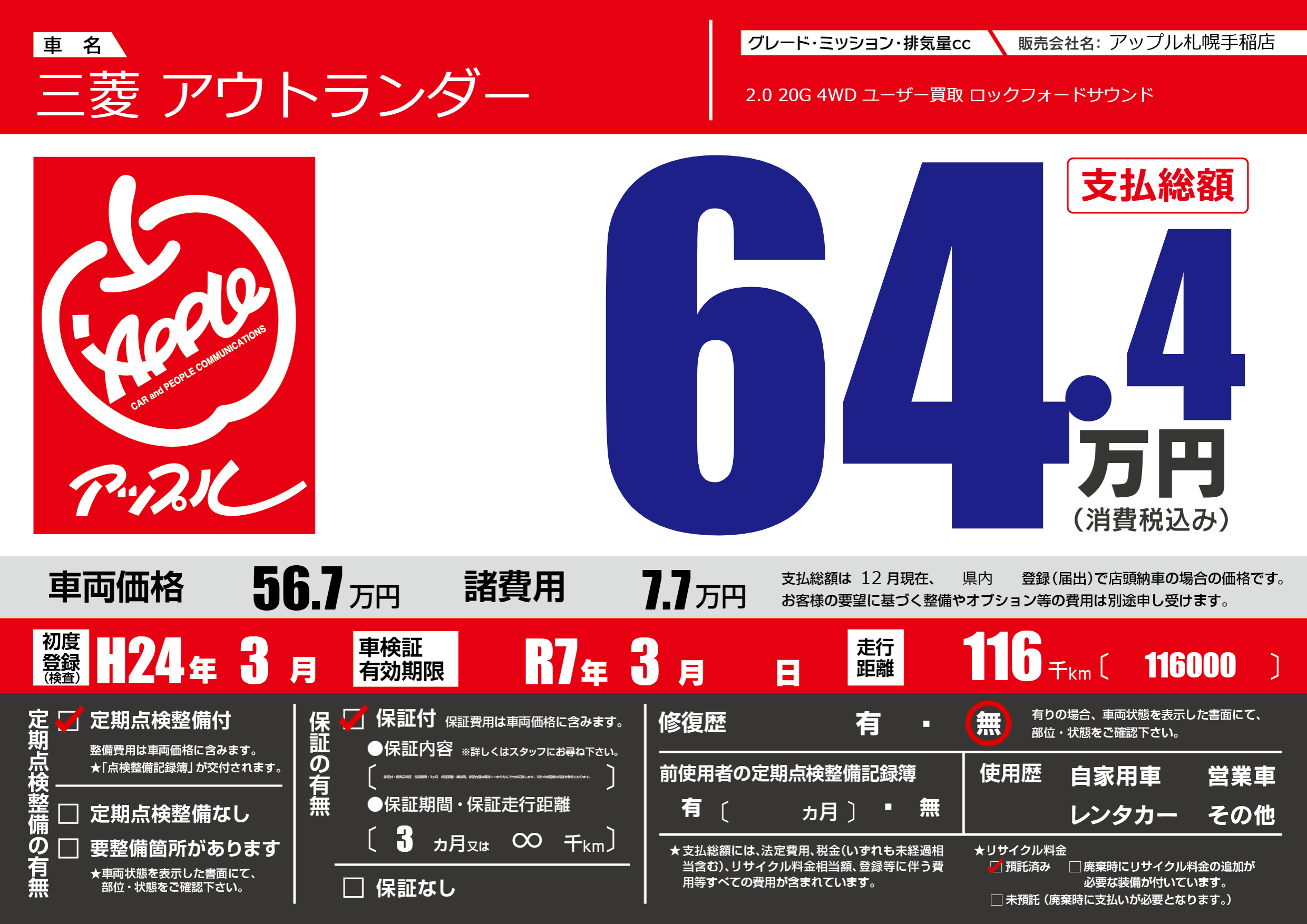| 走行キロ | 11.6万km | 初年度登録 | H24年3月 |