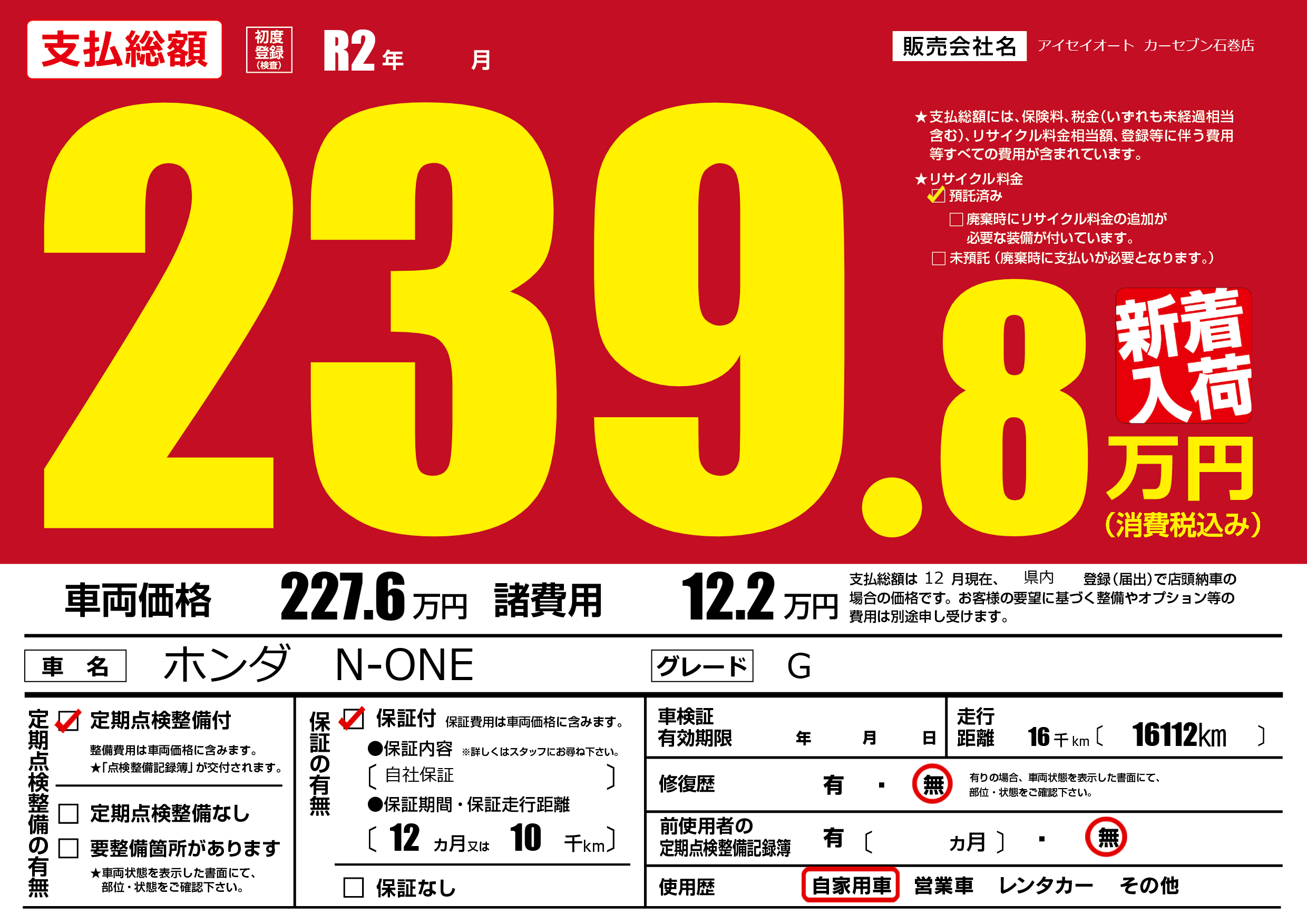 | 車名 | ホンダ N-ONE | グレード ミッション 排気量 |