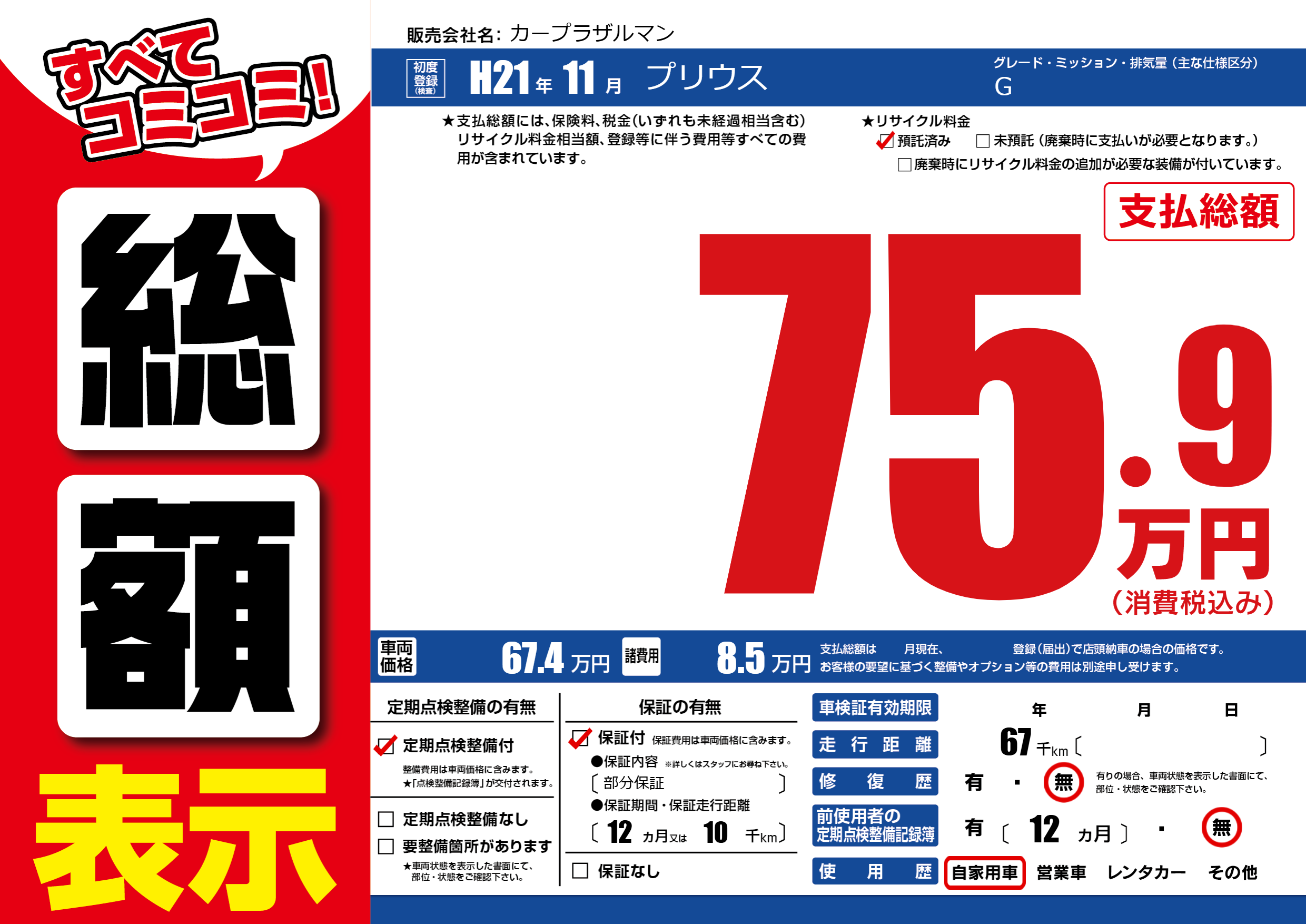 | 車名 | プリウス | グレード ミッション 排気量 |
