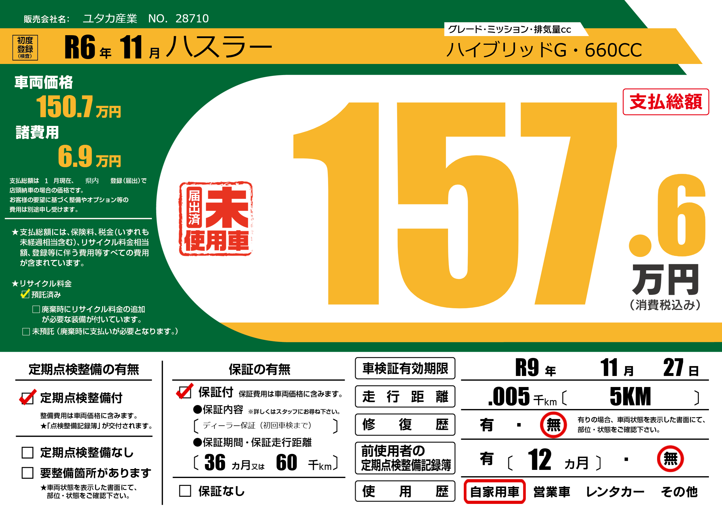 | 走行キロ | - | 初年度登録 | R6年11月 |