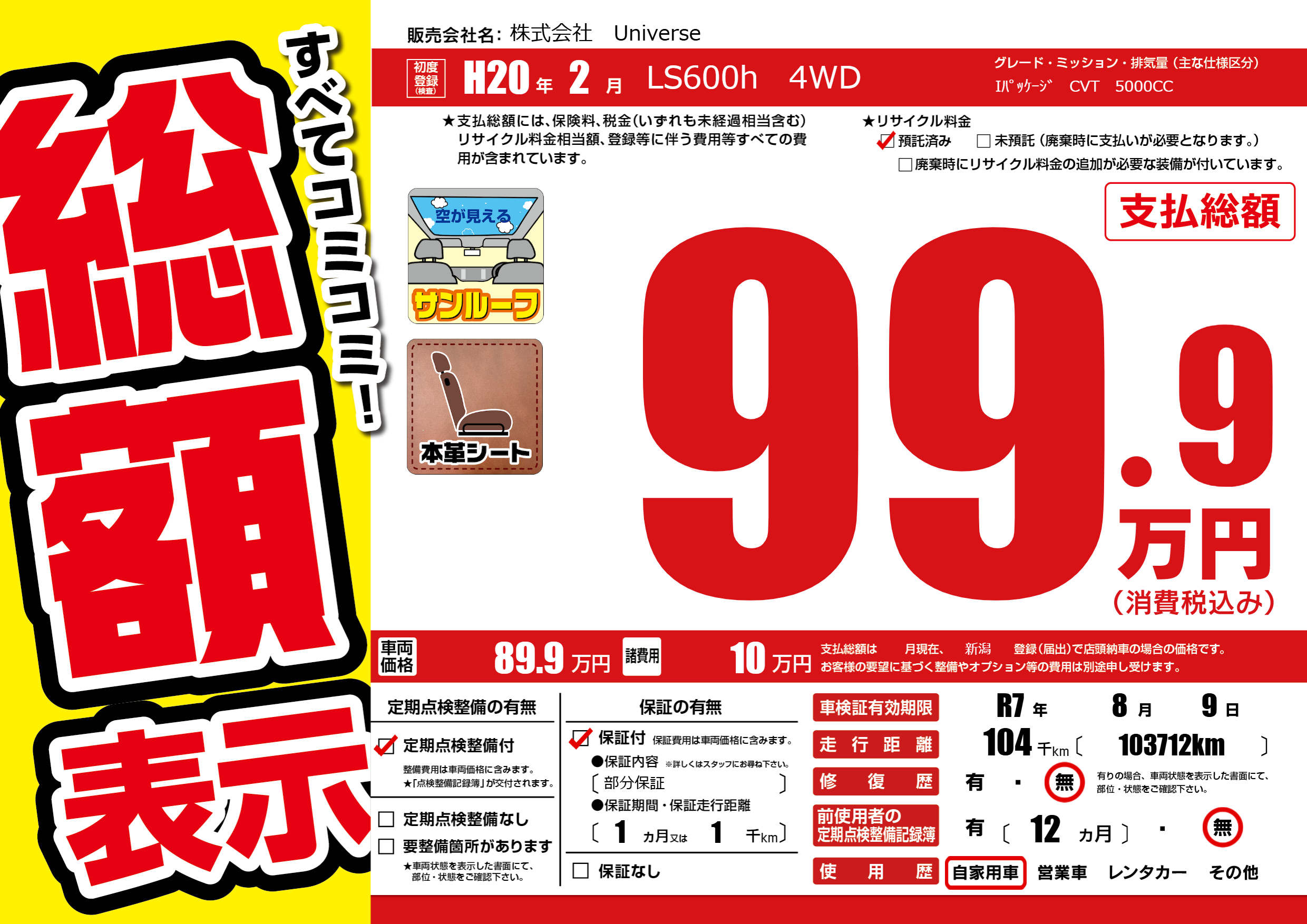 | 車名 | LS600h 4WD | グレード ミッション 排気量 |