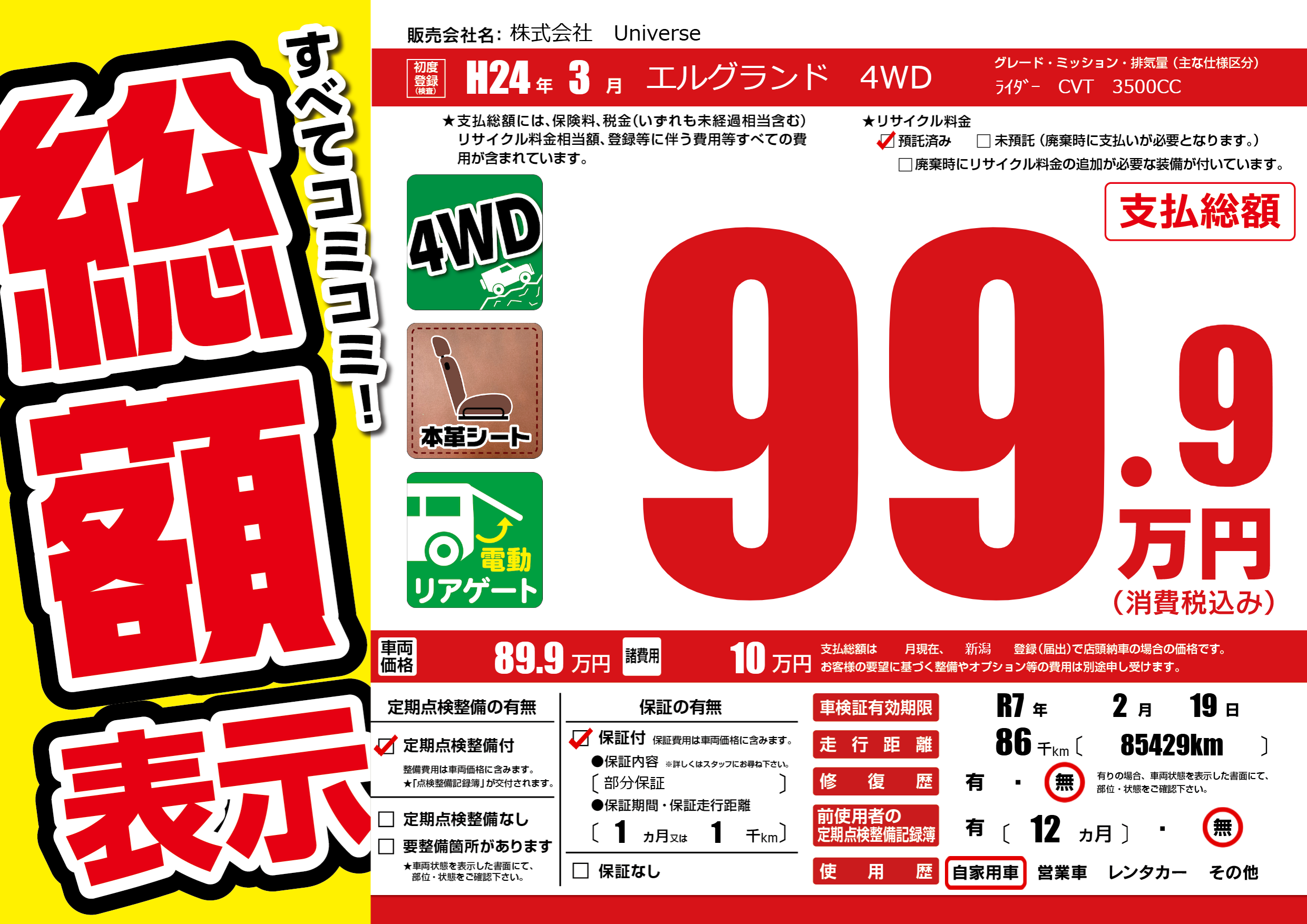 | 車名 | エルグランド 4WD | グレード ミッション 排気量 |