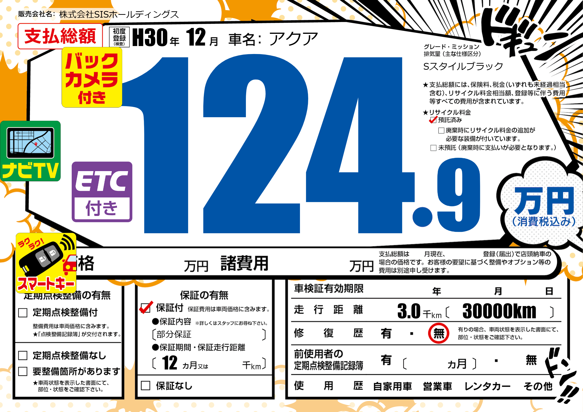 | 走行キロ | 0.3万km | 初年度登録 | H30年12月 |