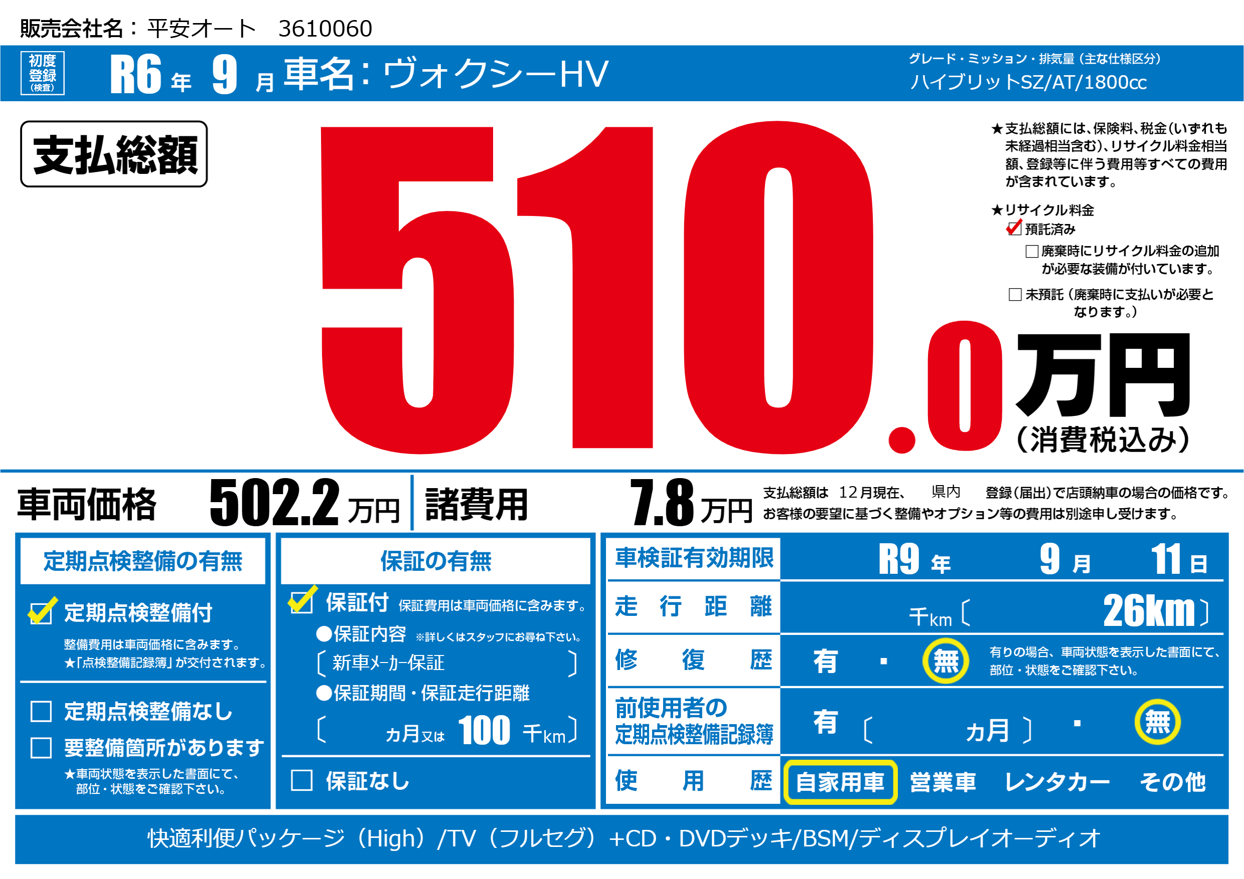 なし | 車検制限 | R9年9月11月 |