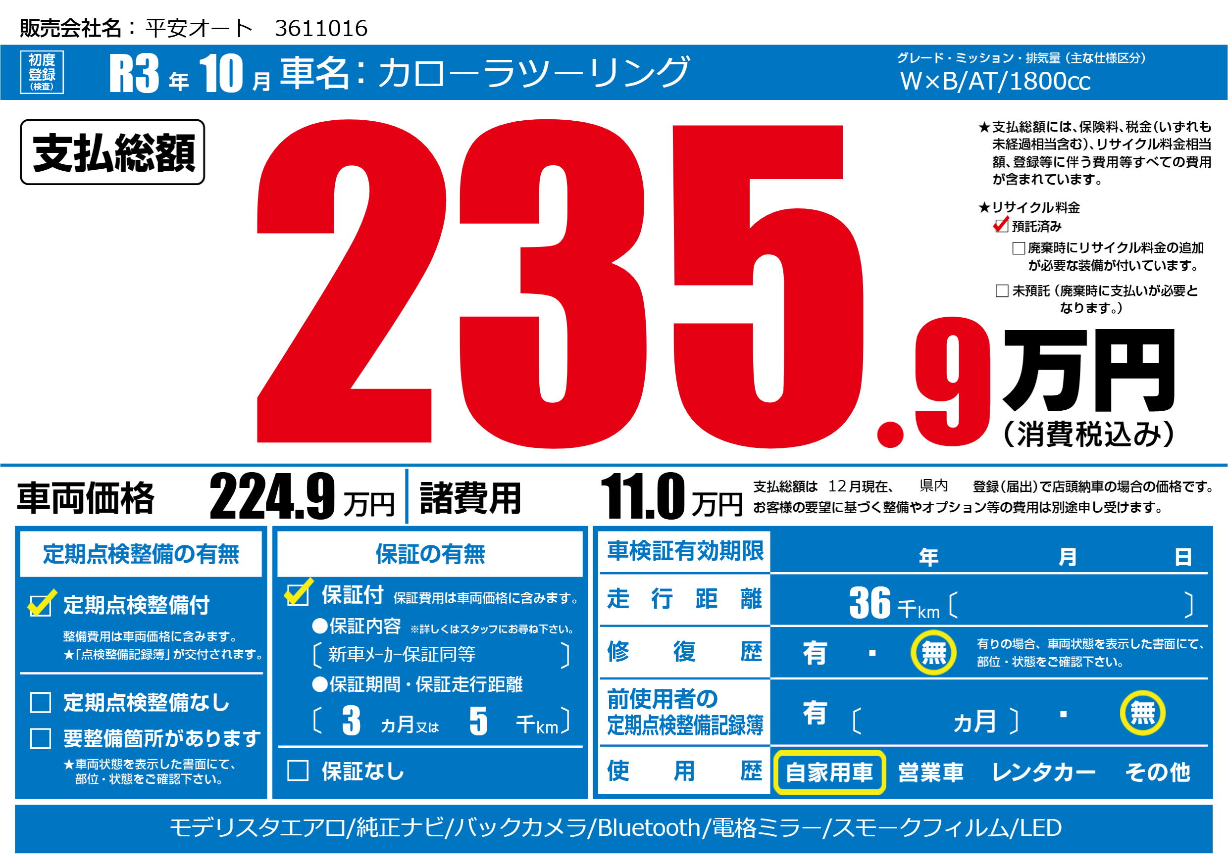 | 走行キロ | 3.6万km | 初年度登録 | R3年10月 |