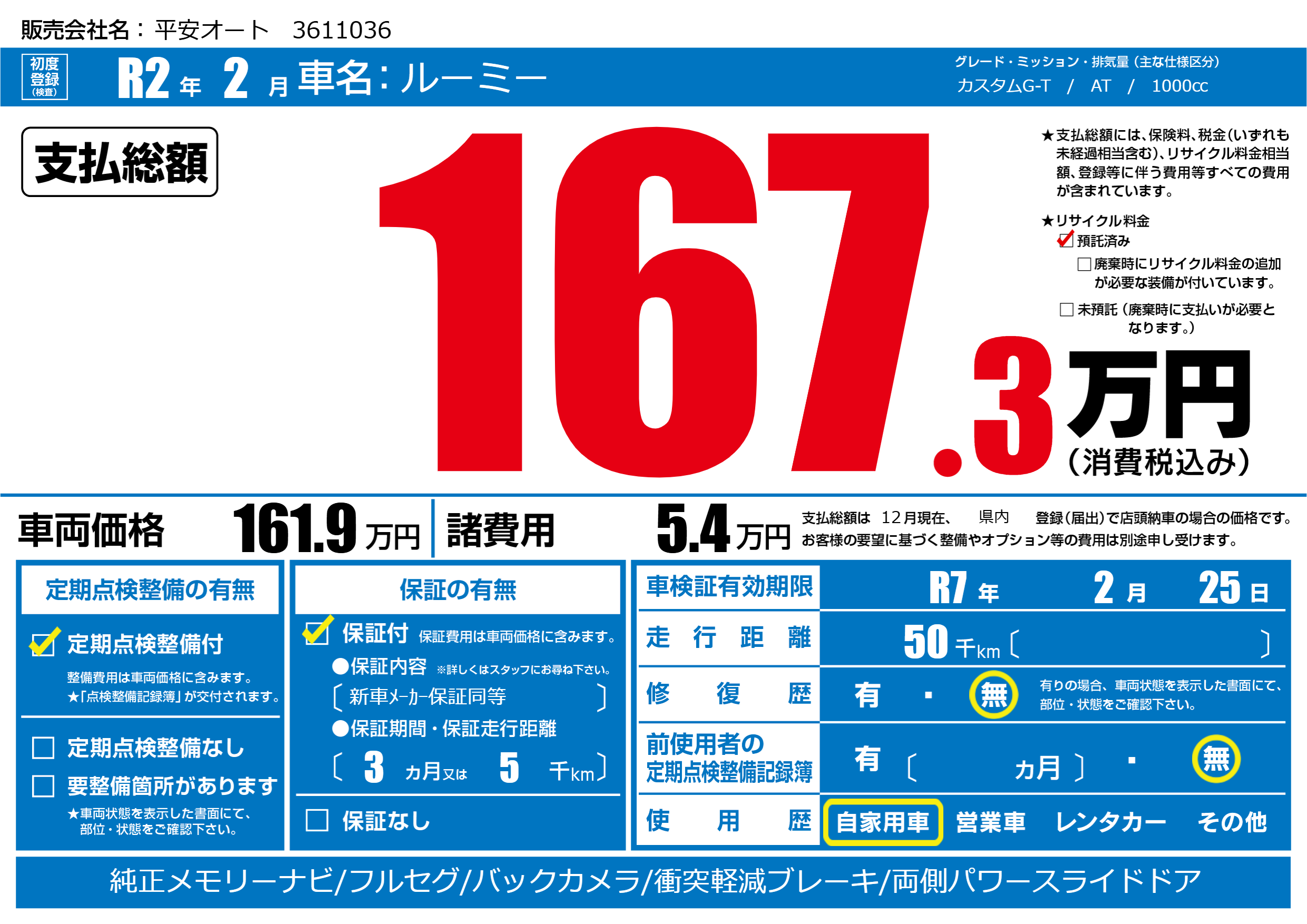 | 車名 | ルーミー | グレード ミッション 排気量 |