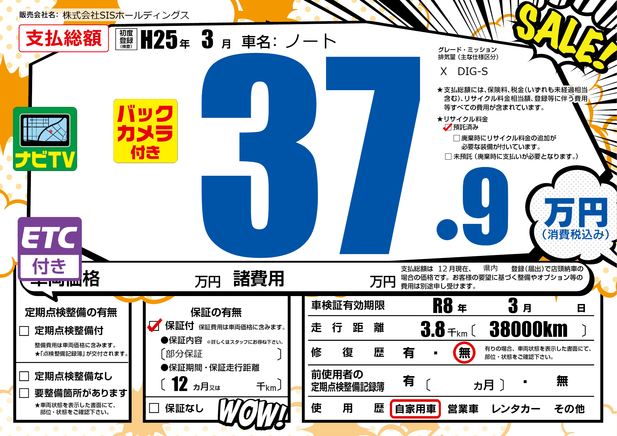 | 走行キロ | 0.3万km | 初年度登録 | H25年3月 |