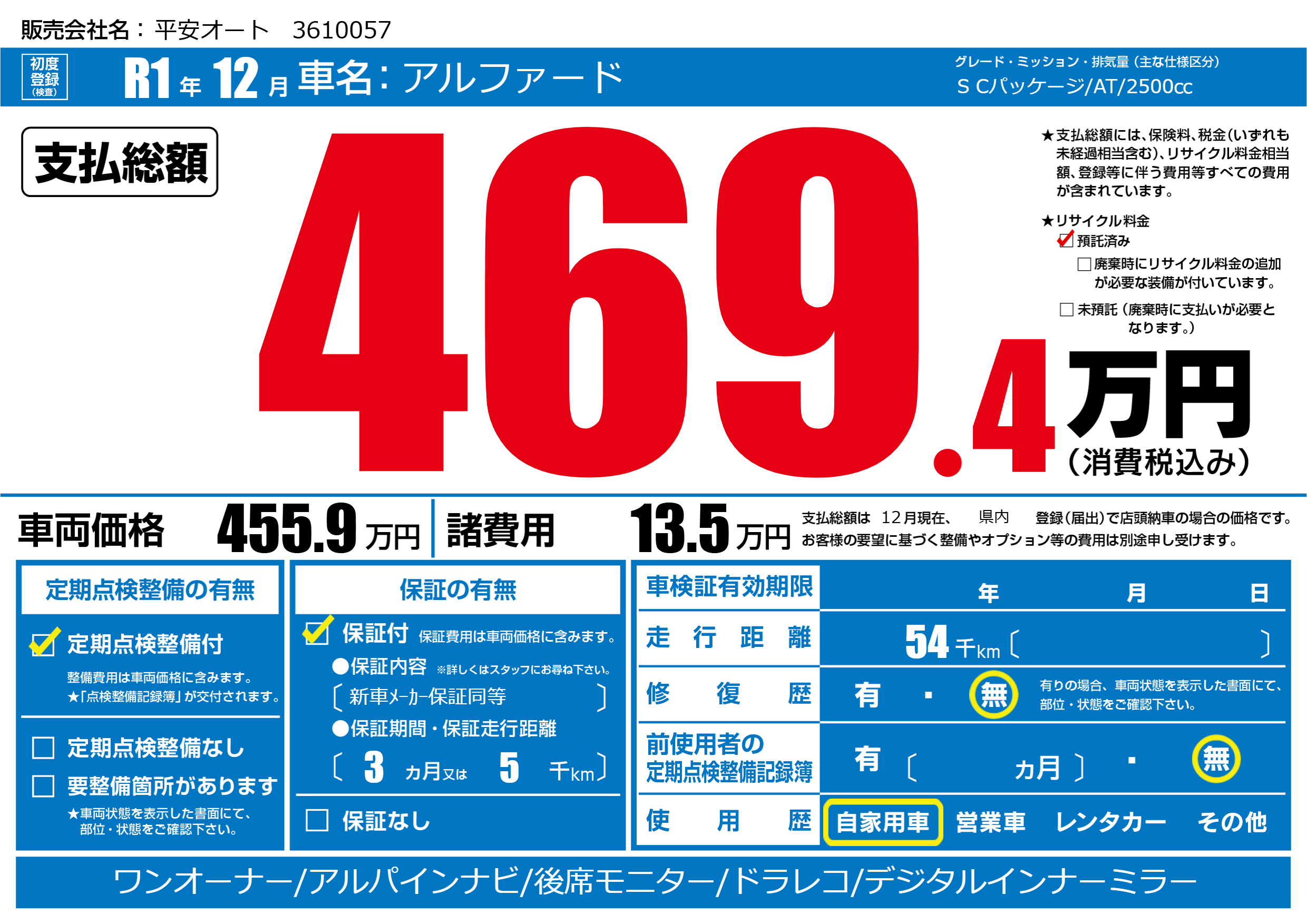 | 車名 | アルファード | グレード ミッション 排気量 |