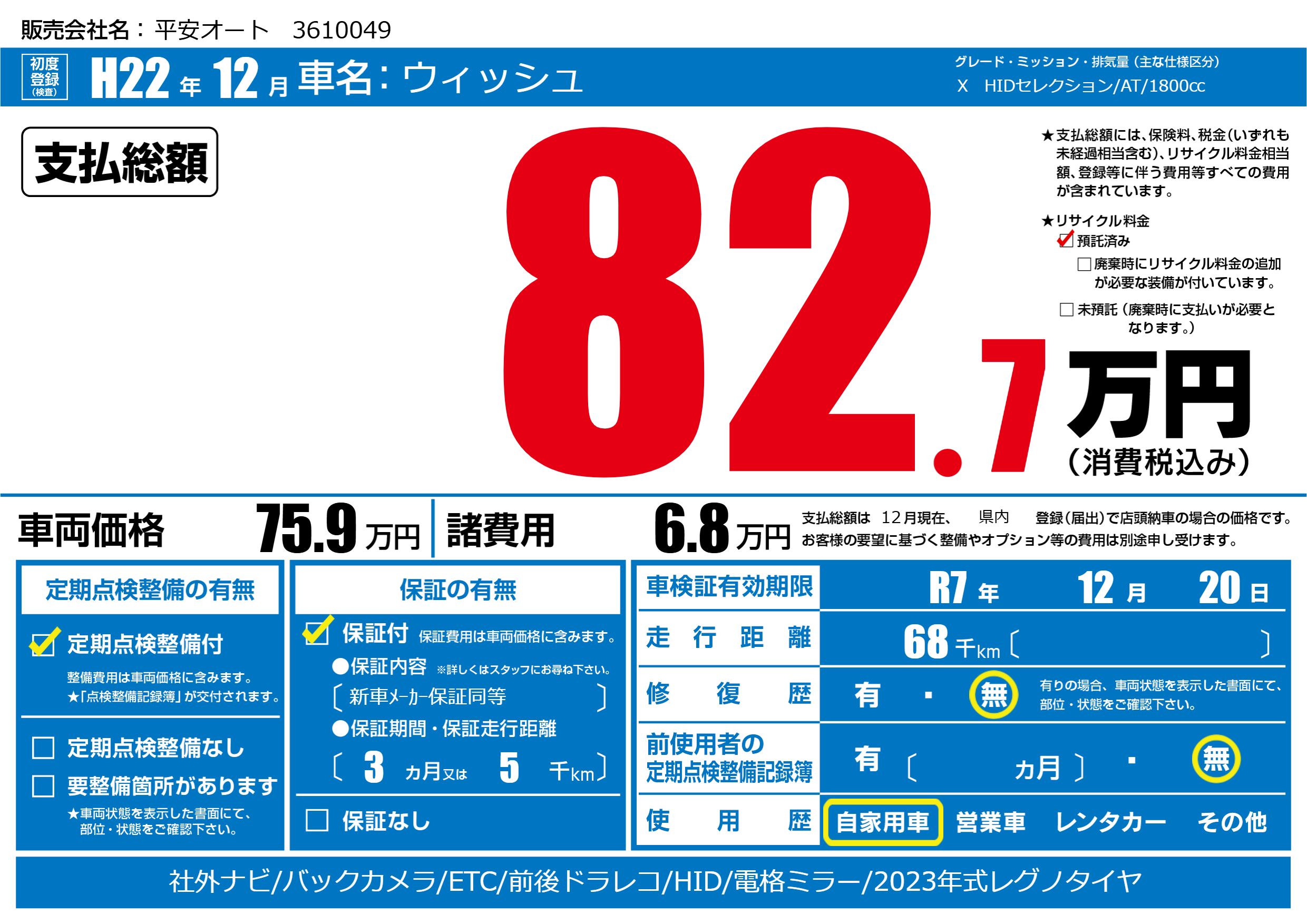 | 走行キロ | 6.8万km | 初年度登録 | H22年12月 |