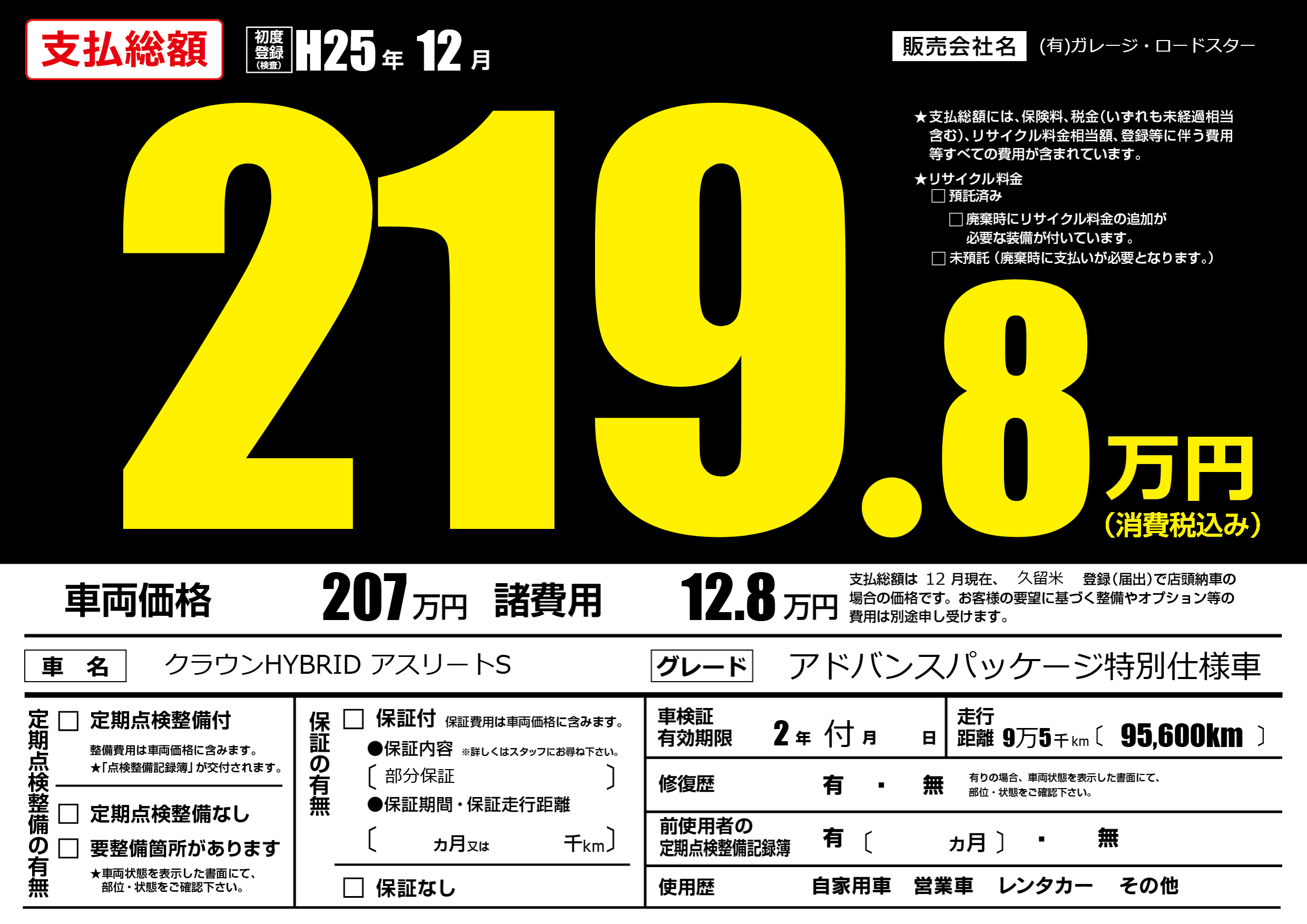 保証なし 保証内容(部分保証) ---ヶ月または()千kmまで |